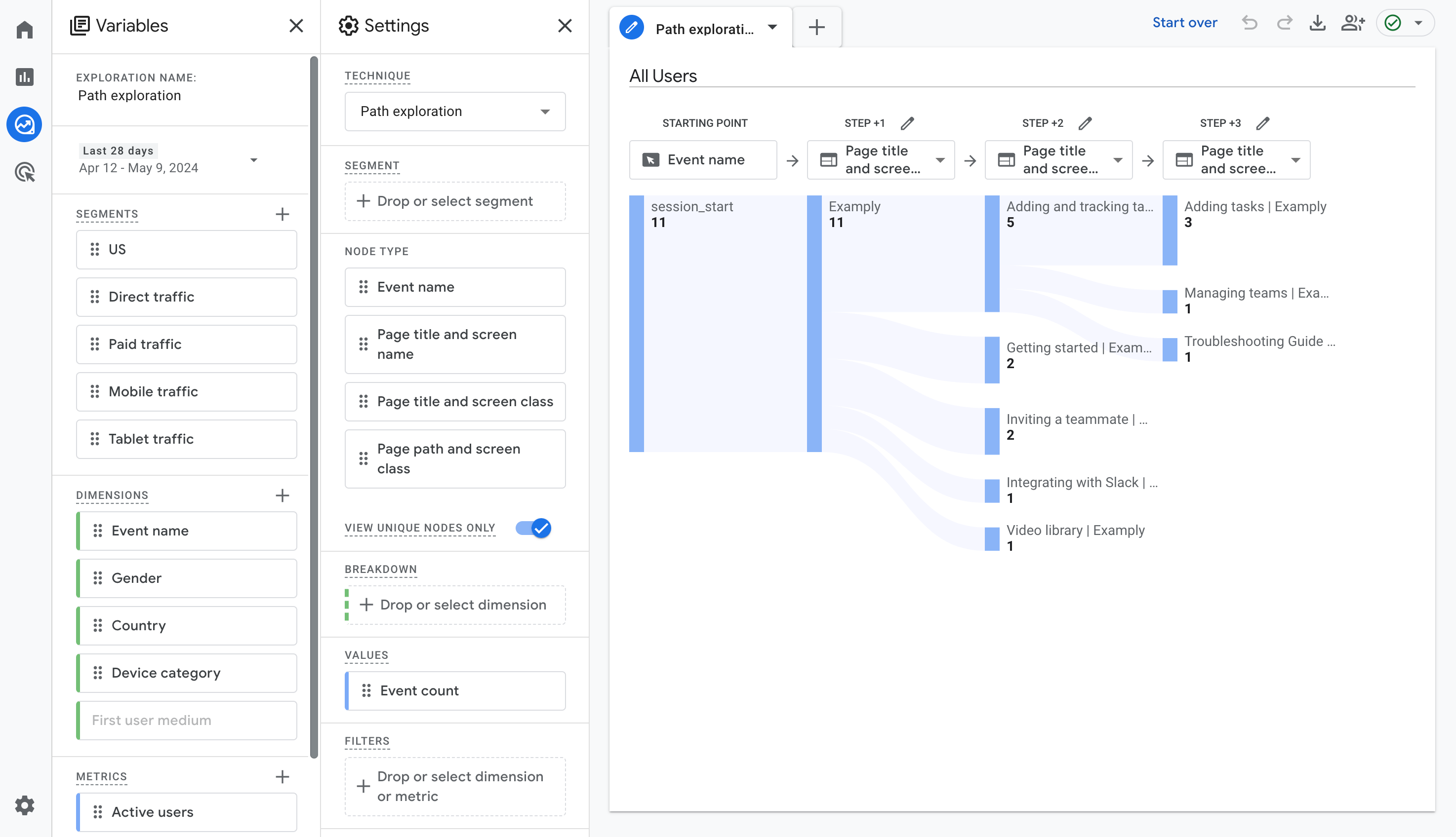 3. How many articles they read in a session - this is found under the "Explore" tab by creating a new "Path exploration"