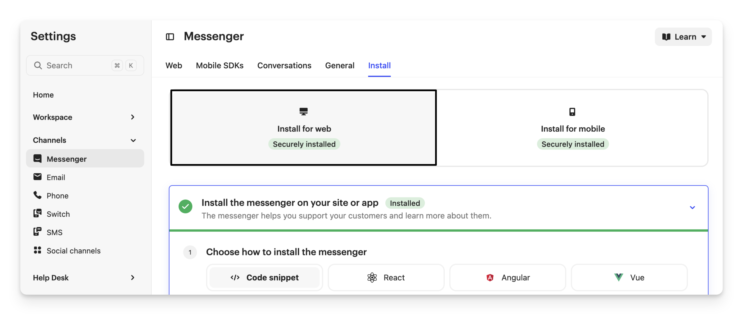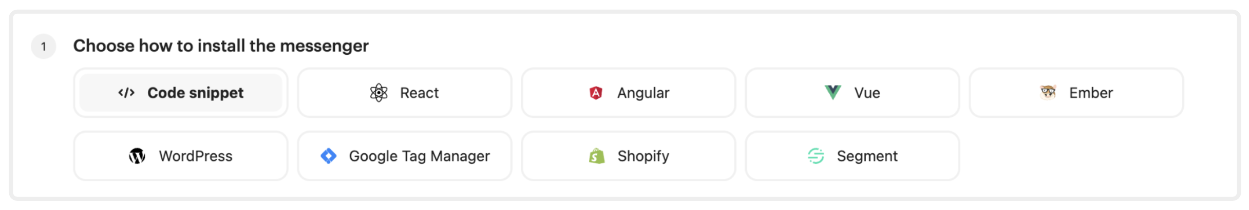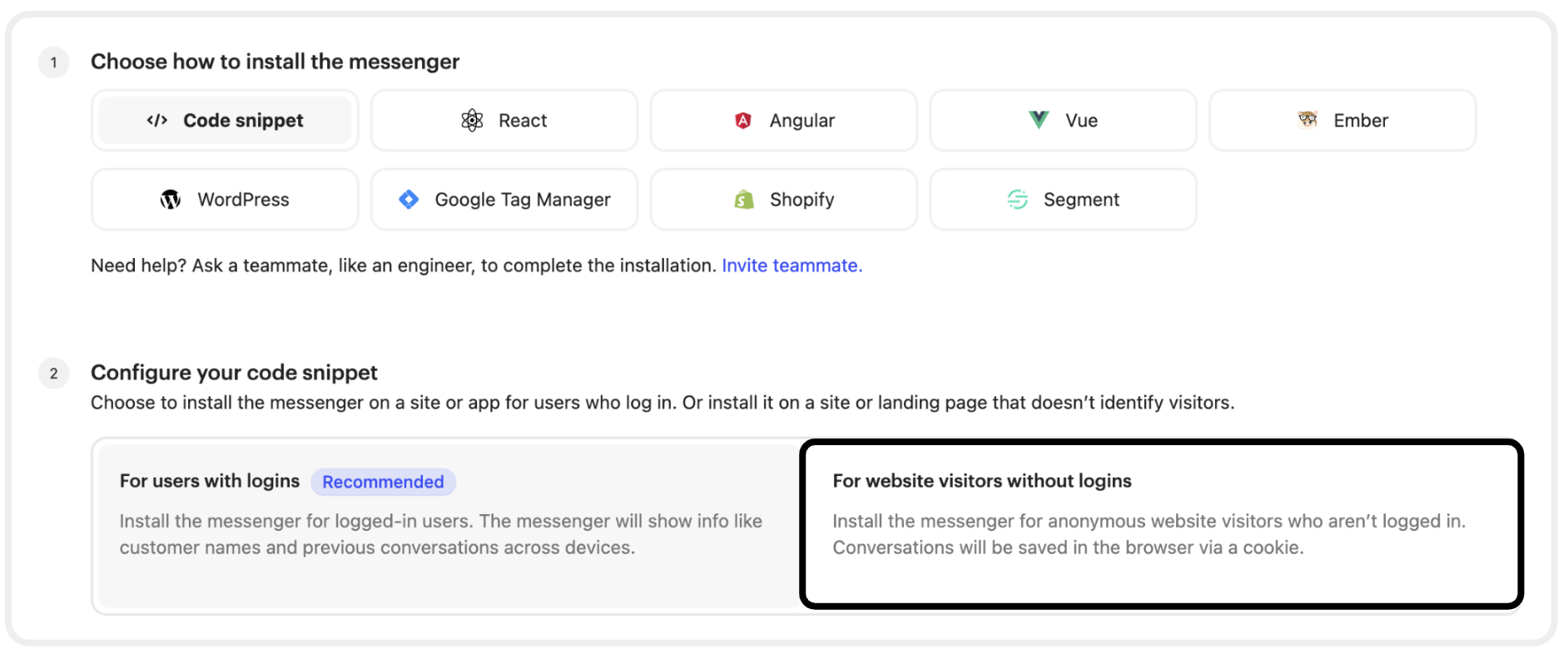 If you select Code snippet, React, Angular, Vue, Ember or Shopify as the installation method, you'll have the choice of installing Intercom for website visitors without logins.