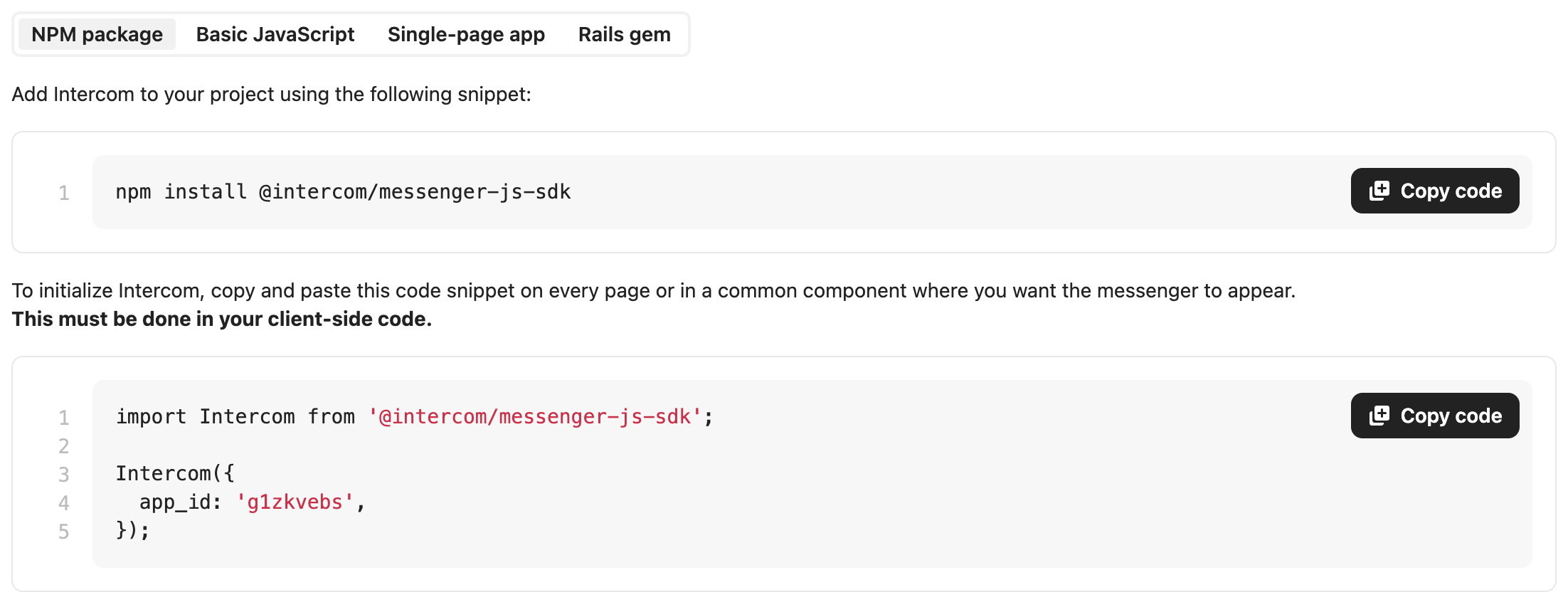 If you selected the Code snippet, React, Angular, Vue, or Ember method, you'll be provided with an NPM package containing a code snippet to copy and paste into the codebase of your own app. This snippet is pre-populated with your unique workspace ID, so it's ready to go.