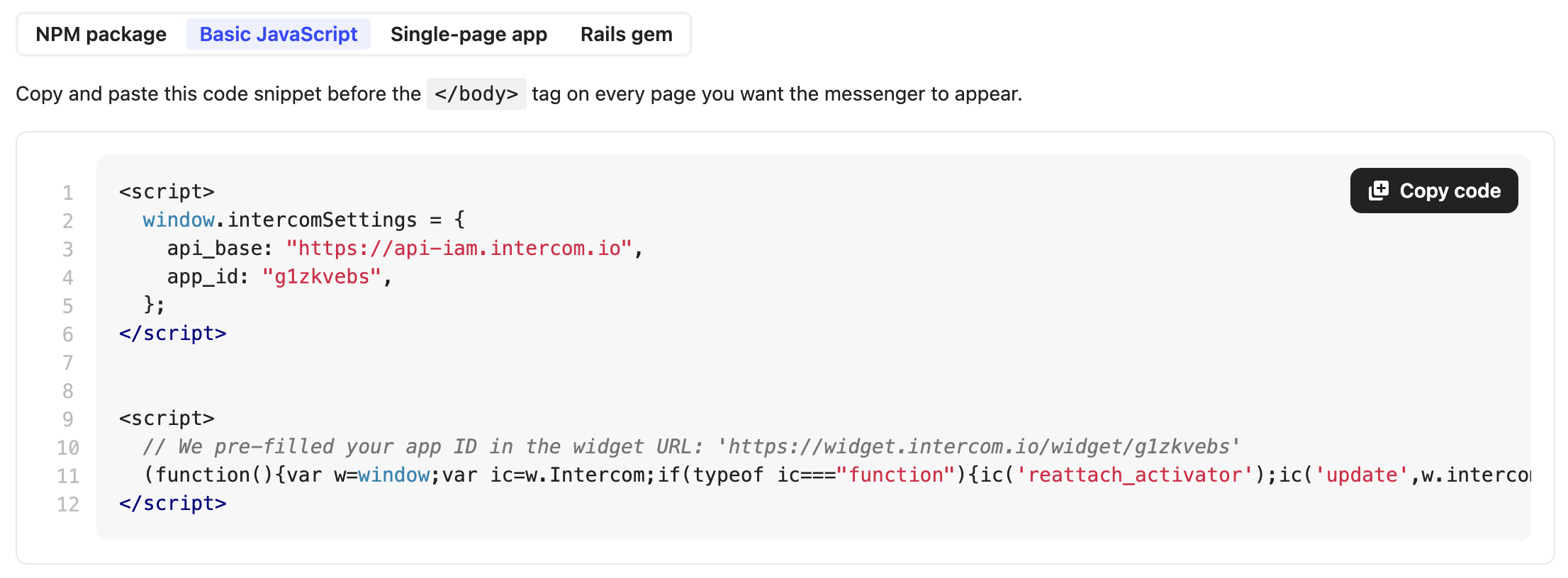 If you don't have access to the Intercom workspace, you can grab the JavaScript code here 👇 You will need to manually replace WORKSPACE_ID with the unique workspace ID for your Intercom account.