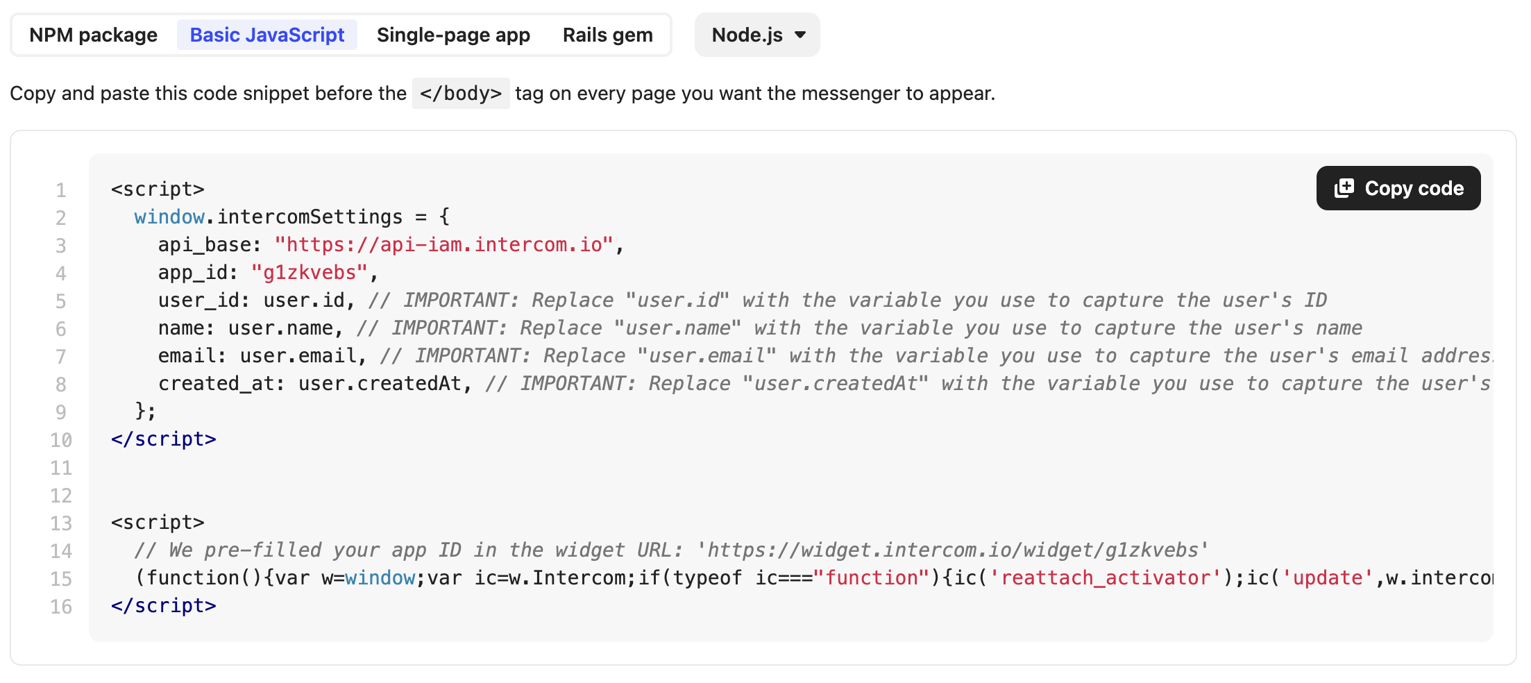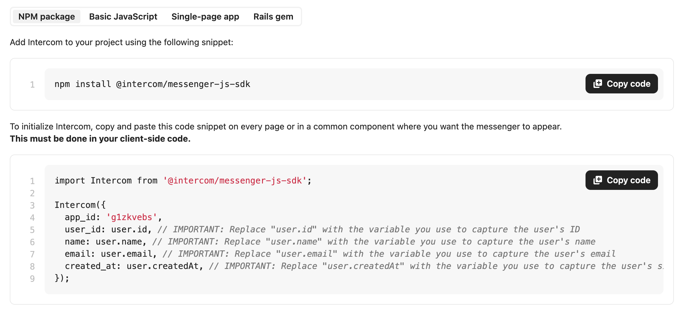 If you selected the Code snippet, React, Angular, Vue, or Ember method, you'll be provided with an NPM package containing a code snippet to copy and paste into the codebase of your own app. This snippet is pre-populated with your unique workspace ID, so it's ready to go.