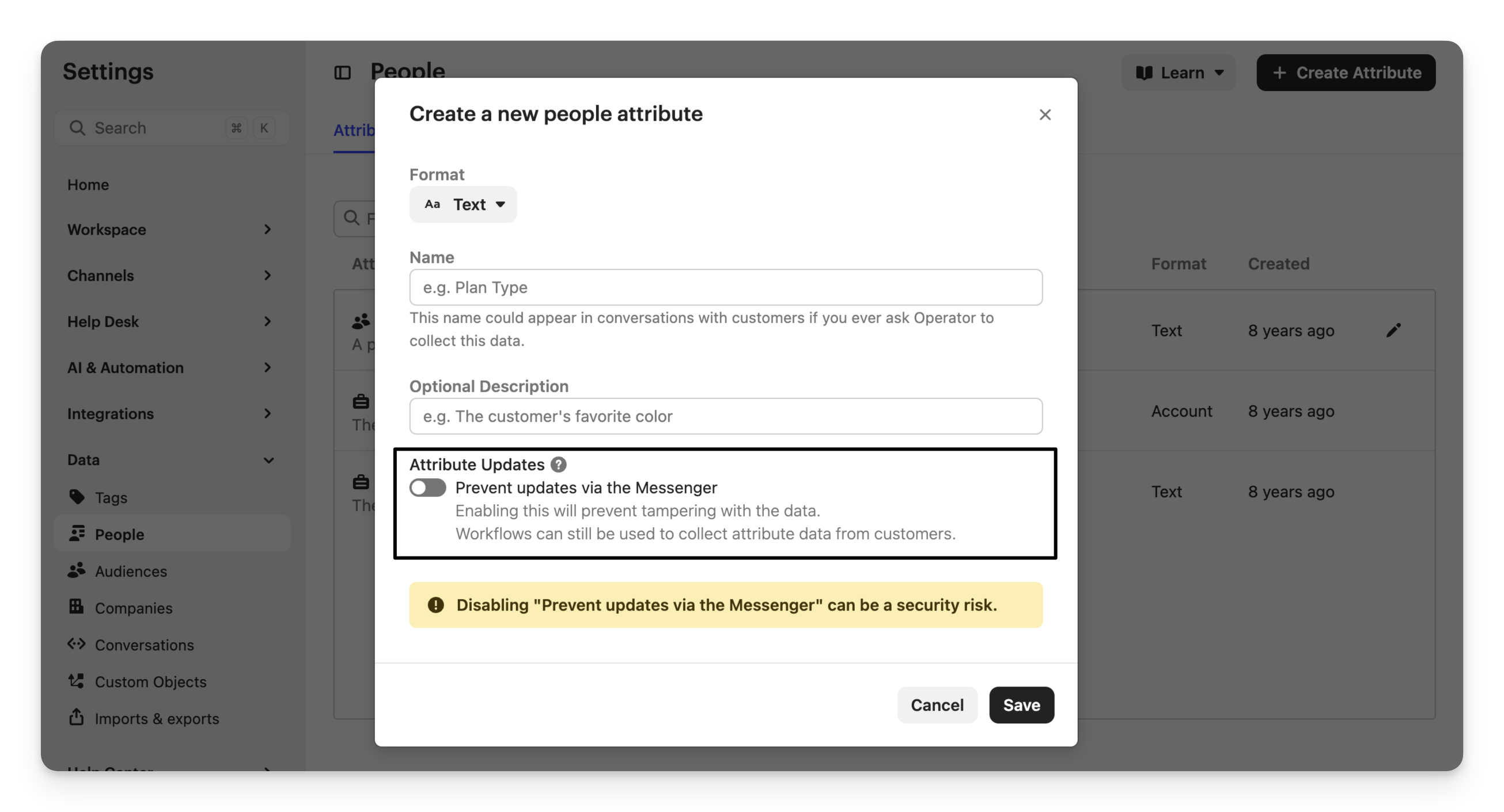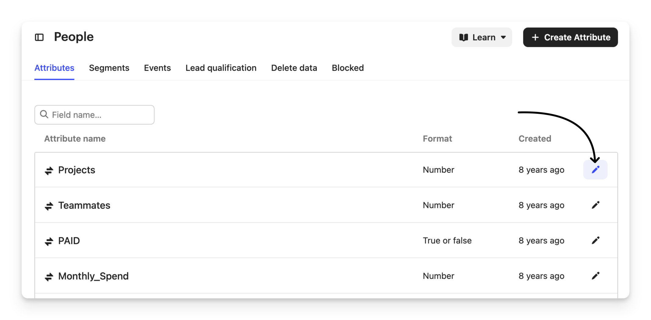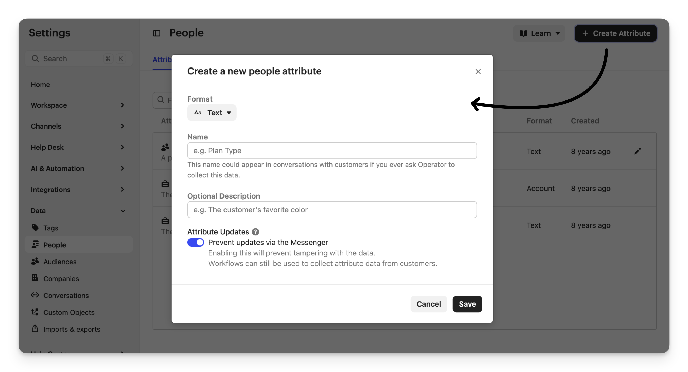 To create a new attribute in Intercom, go to Settings > Data > People and click + Create attribute. Give your new attribute a name, a description, select the type of data it will store.