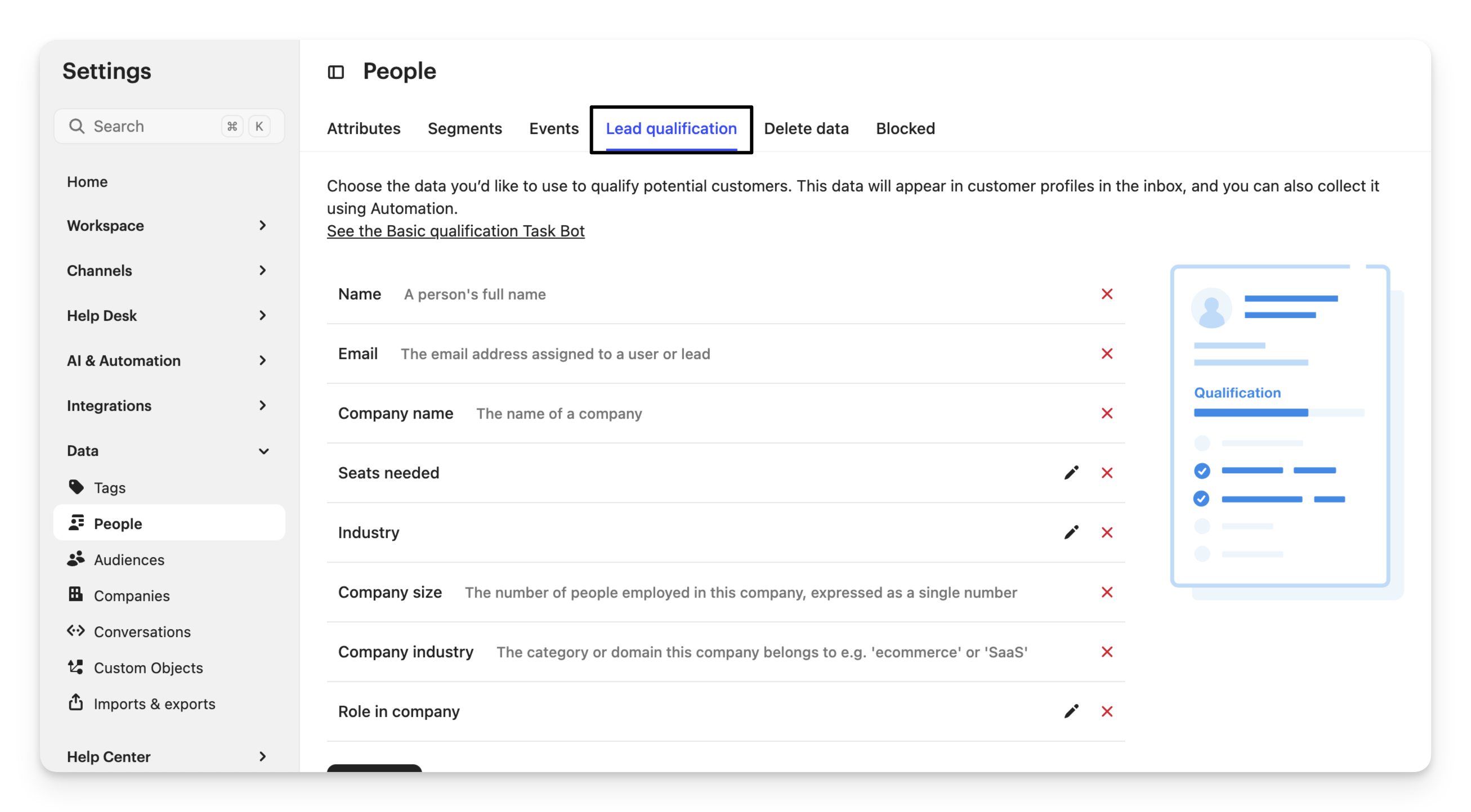 To create new custom qualification data, go to Settings > Data > People > Lead qualification.