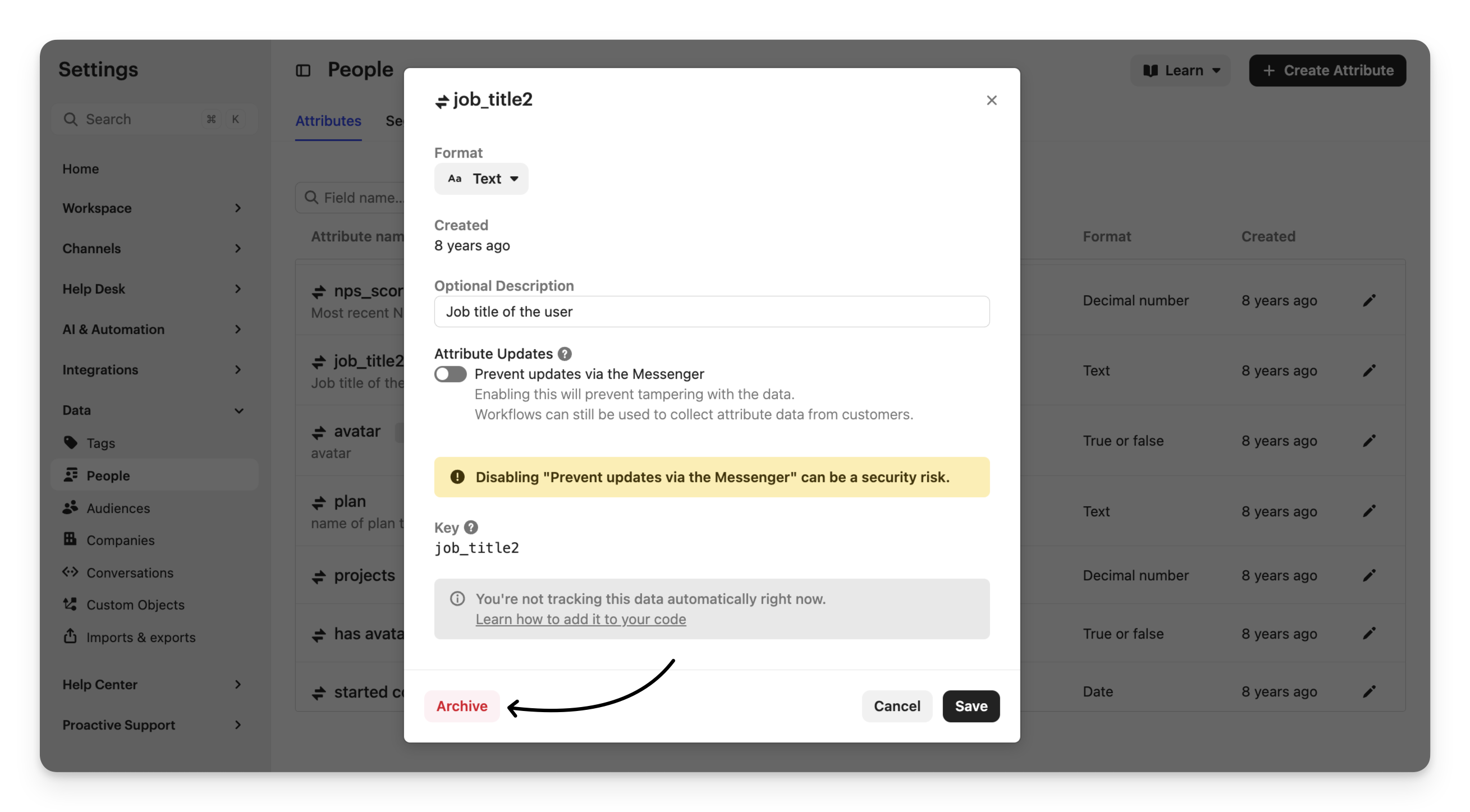 Choose a piece of data you'd like to archive. Click the edit icon next to it and then click Archive in the pop-up box. You can unarchive them if you change your mind, but you can’t completely delete custom data attributes.