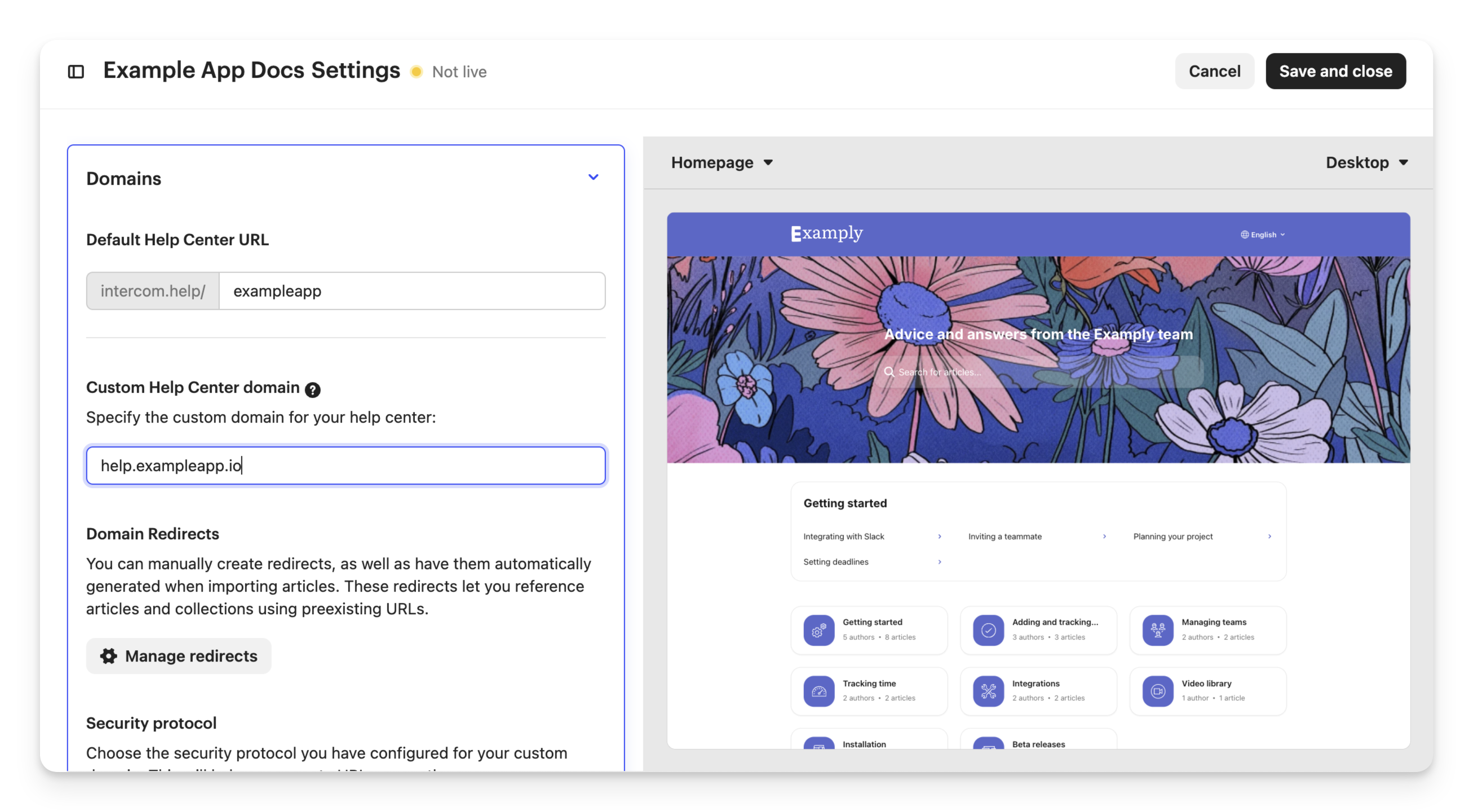 If you’d prefer to have your Help Center available at your own subdomain like “help.exampleapp.io”, you can set a custom domain.