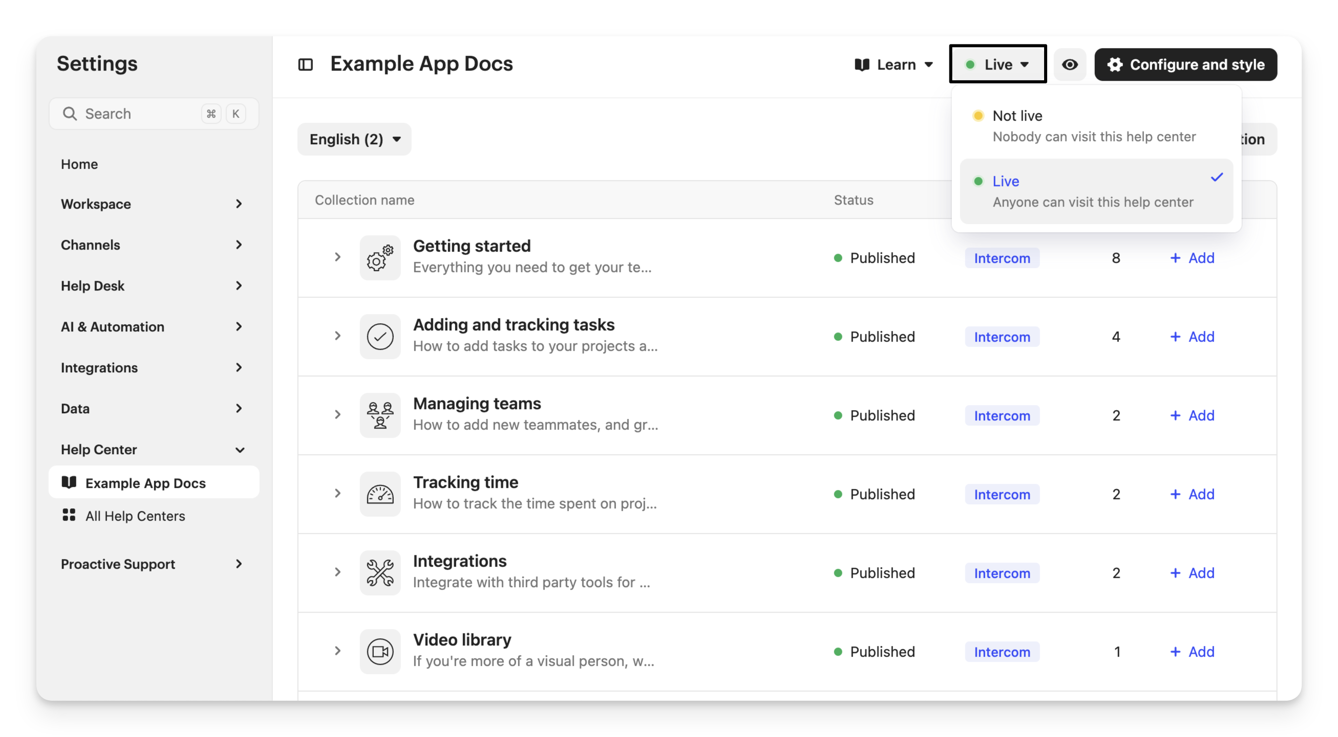 The final step is to make your Help Center accessible to customers and available to search engines. Go to Settings > Help Center and set it Live from the dropdown menu at the top.