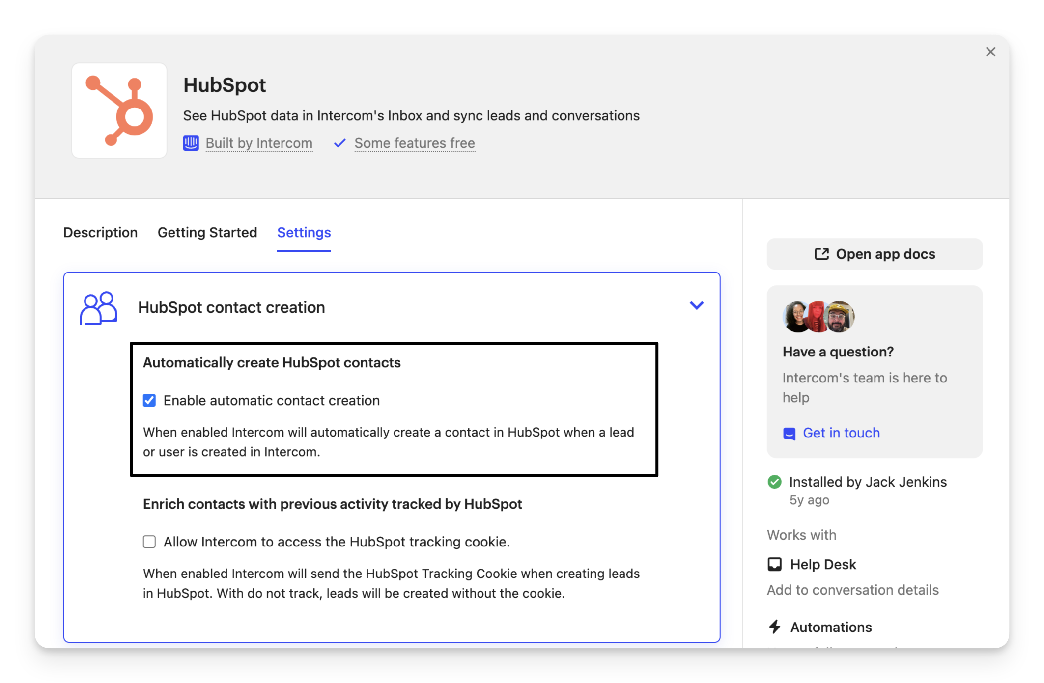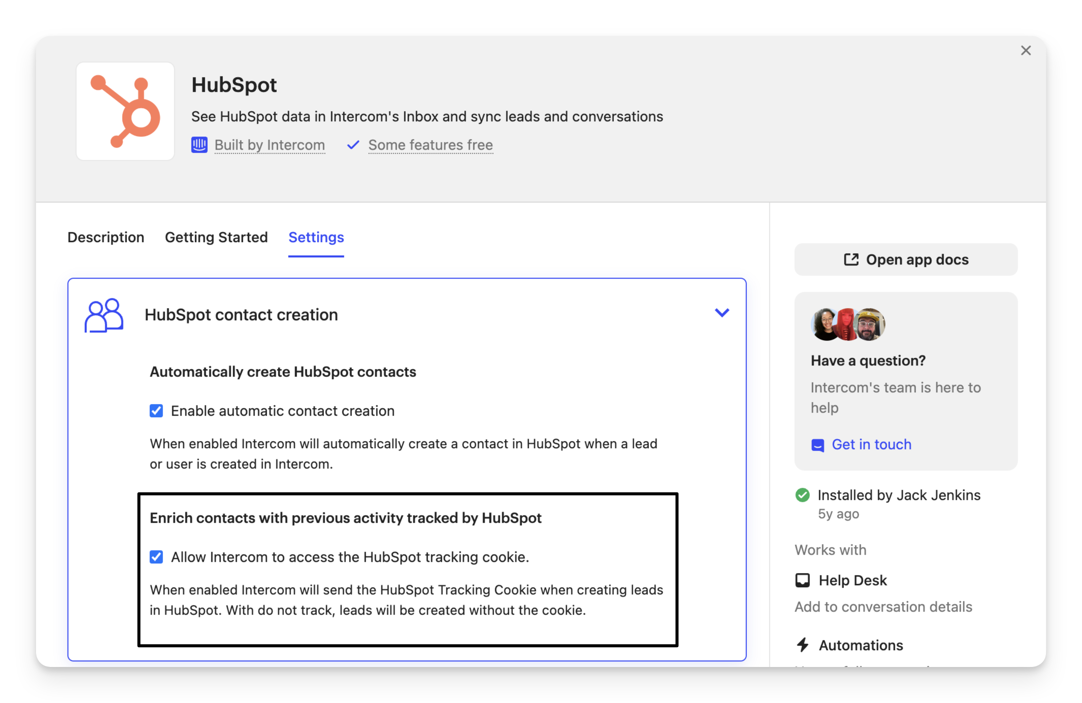 Now open App Store > HubSpot > Settings and check the box to “Allow Intercom to access the HubSpot tracking cookie”: