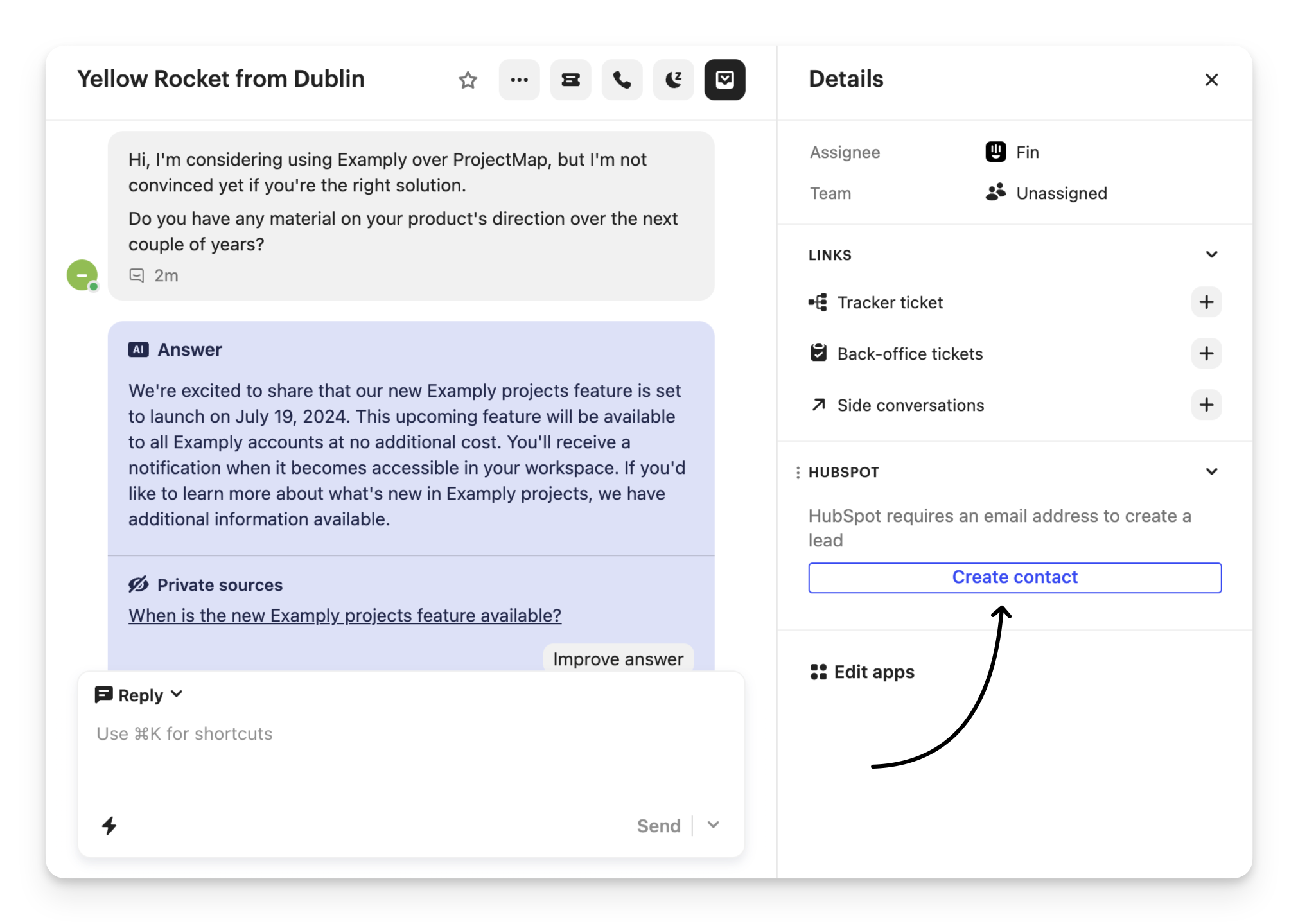 It’s easy to create a contact in HubSpot while you chat to a customer. Just click Create contact in the HubSpot app in the inbox, next to the conversation.