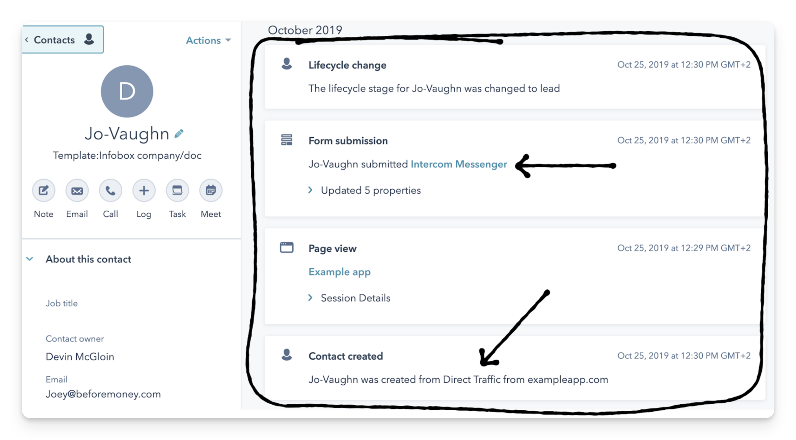 You’ll then see Intercom actions in HubSpot under the contact’s activity: