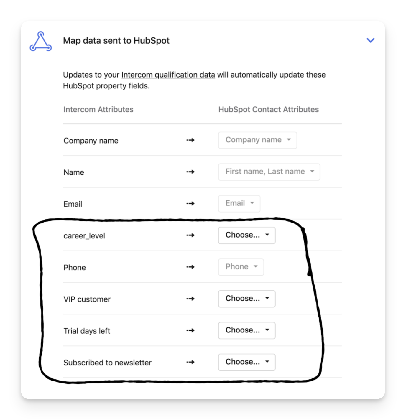 You can also map other qualification attributes from Intercom to HubSpot. From App Store > HubSpot > Settings, open Map data sent to HubSpot and choose a HubSpot contact attribute for each of your qualification attributes in Intercom.