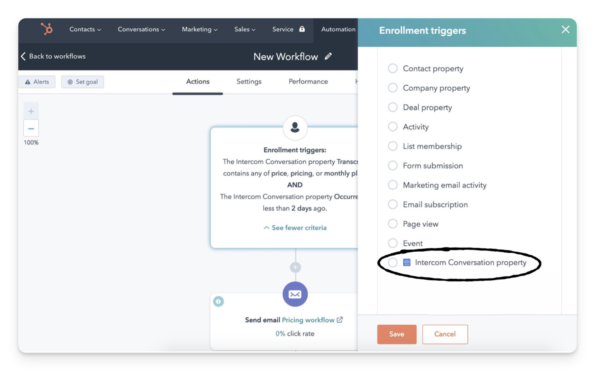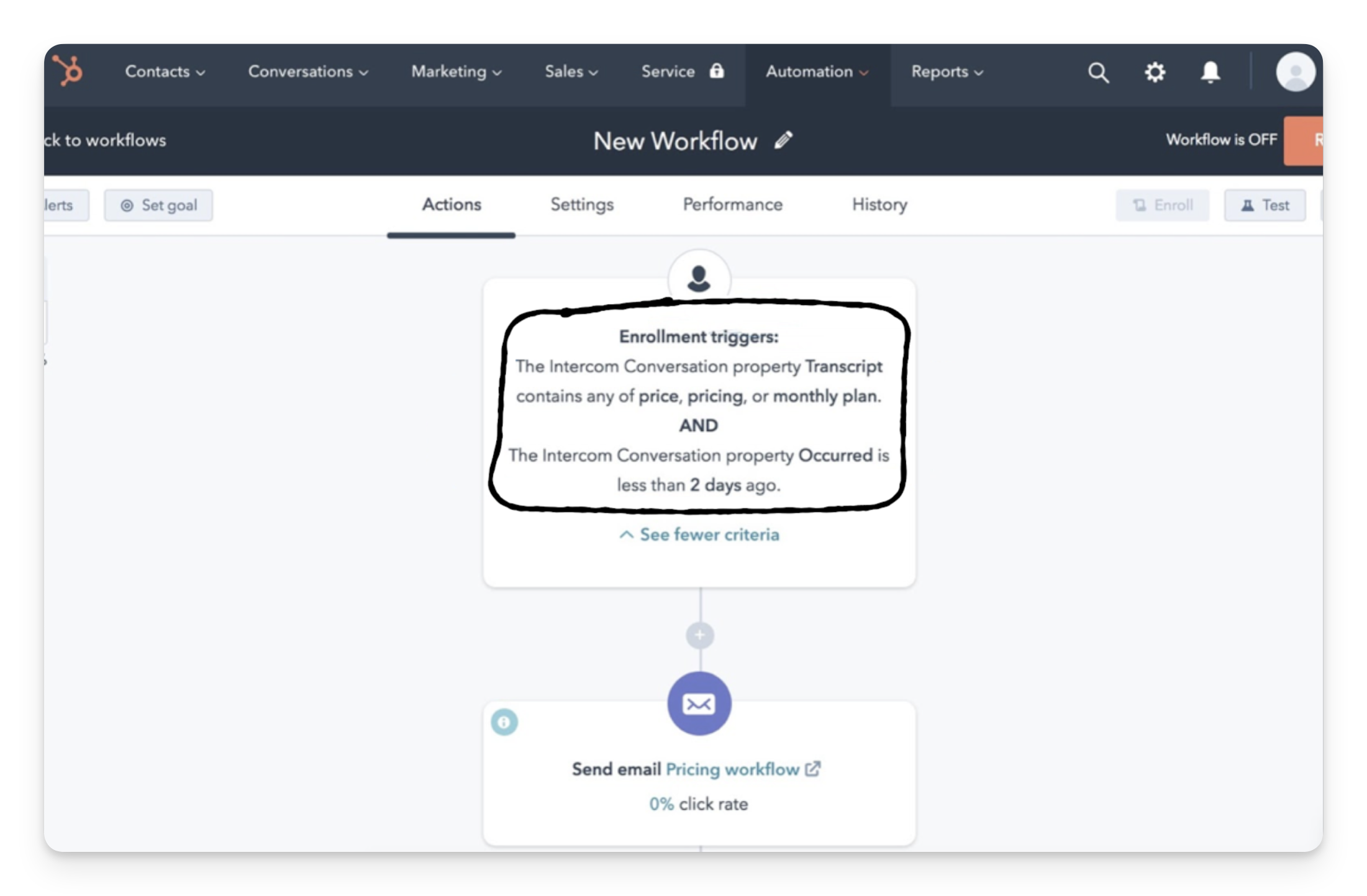 For example, you might have a workflow to automatically nurture new leads who are interested in pricing. You can automatically add new lead conversations from Intercom to this workflow, that mention ‘pricing’ or ‘monthly plans’:
