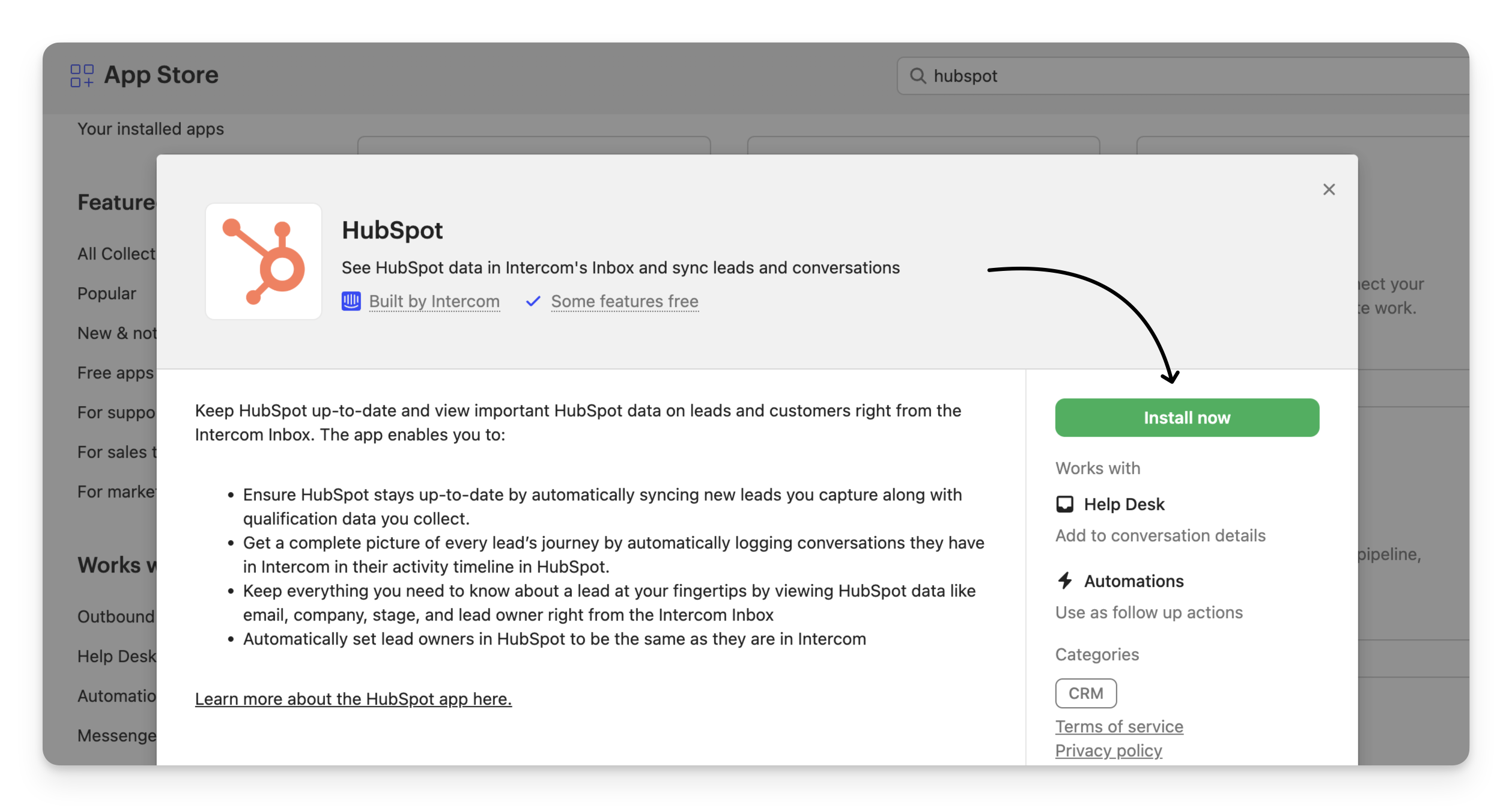 You’ll find HubSpot in the Intercom App store. Click Install now to add it to your Intercom workspace.