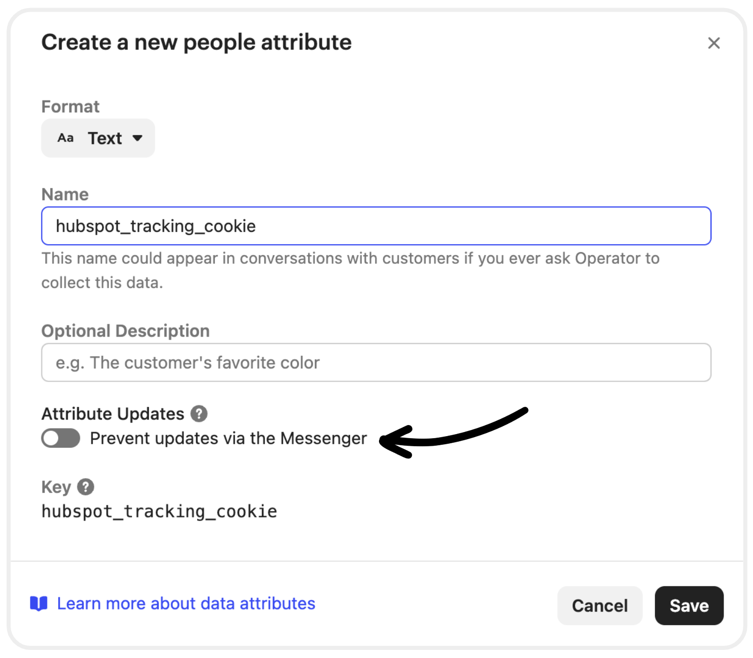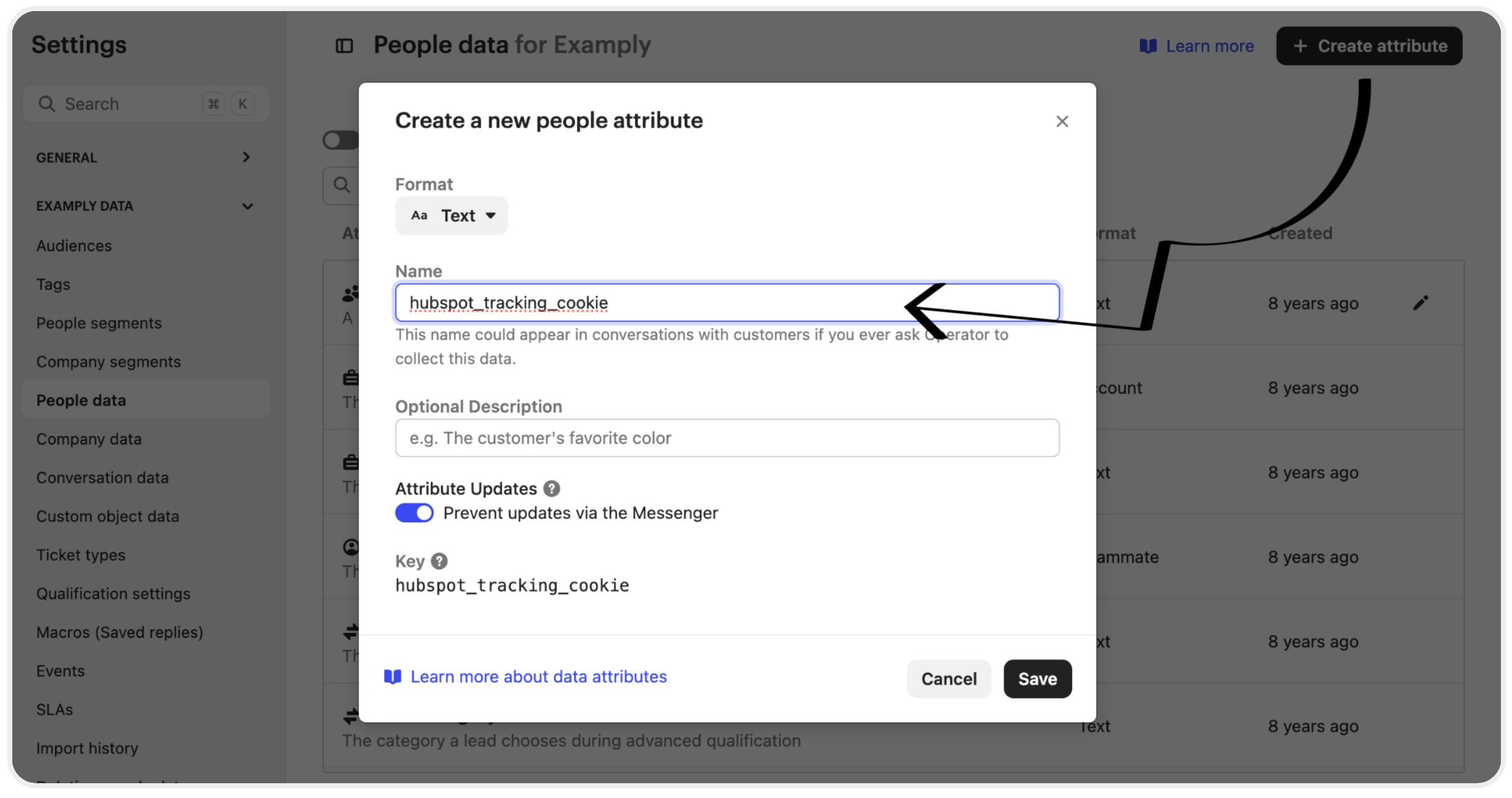 First, create a new Text type attribute with the name hubspot_tracking_cookie from Settings > People data.