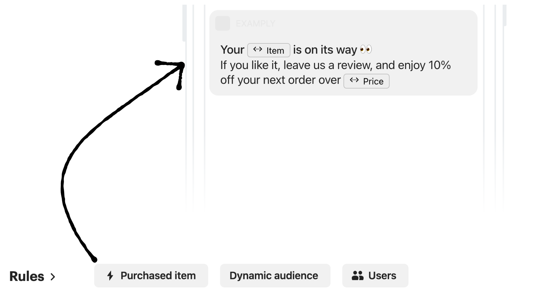 In this example, we’ve tracked an event when a customer has made a purchase. This allows you to ask for a review and include event metadata in the message. As well as noting that the purchase happened, you'll send along some extra details like the price, and name of the item: