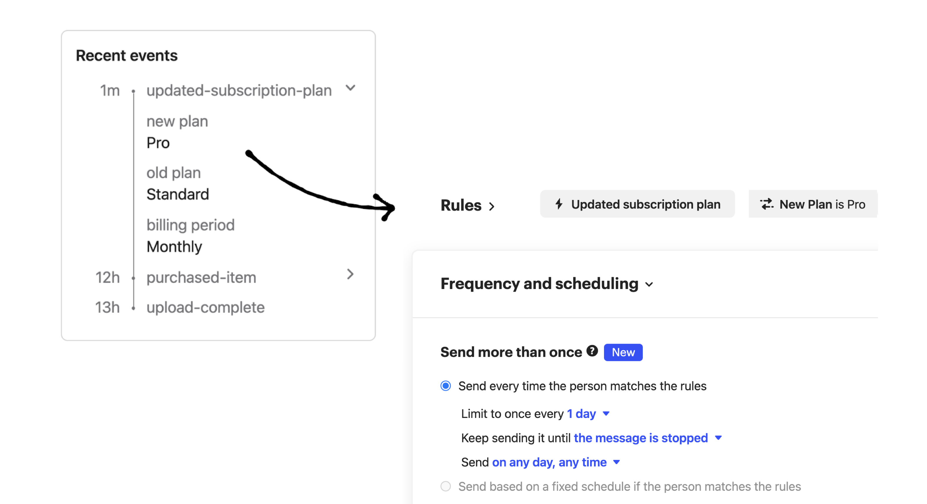 In this example, a user has changed their subscription from the Standard plan to the Pro plan. You can view that as a plain event, or add context to the event by tracking some metadata with it, such as: