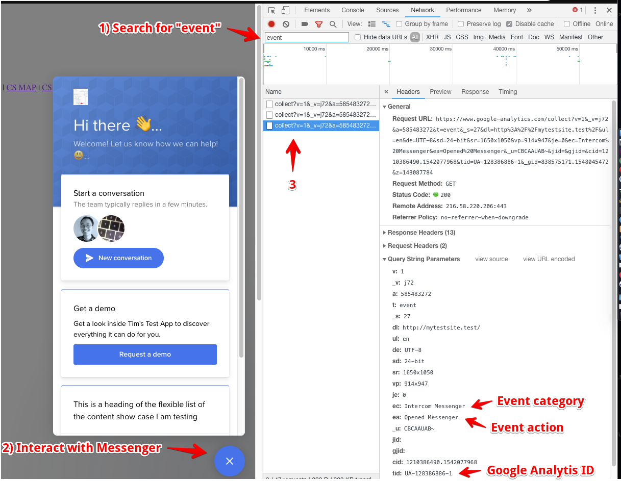 You should be able to see Google Analytics event requests when you open / close the Messenger (when there is no integration set up these events do not fire)