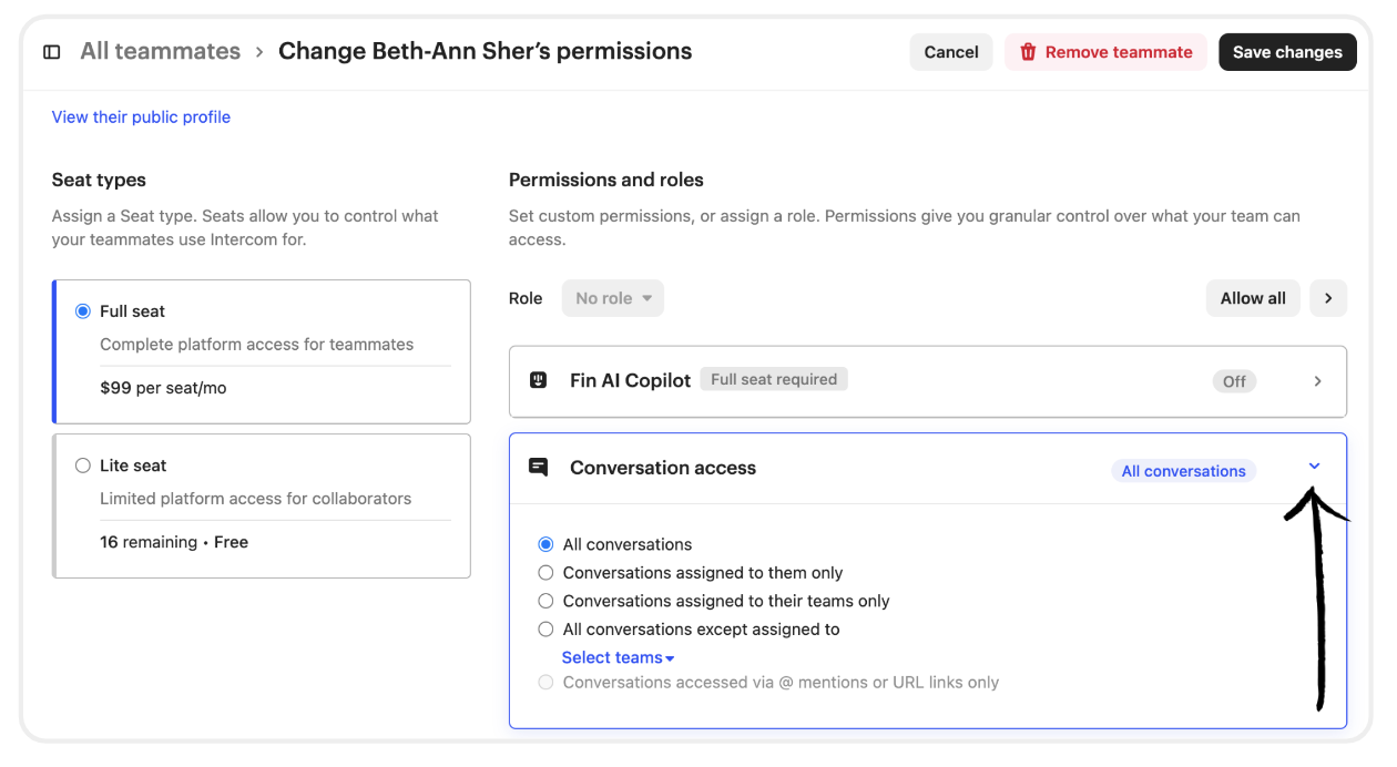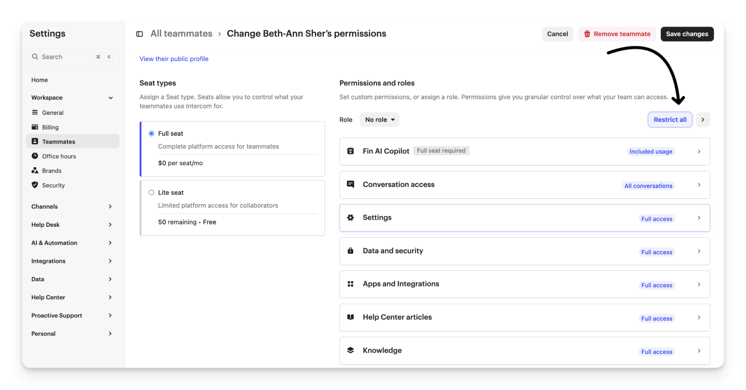 Use the Allow all or Restrict all button to allow all or restrict all permissions for a teammate.