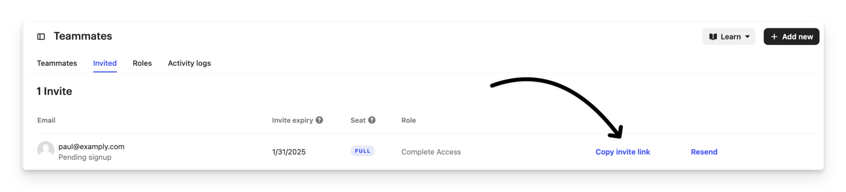Once you add your teammates, they will be sent an email with an invitation to join your workspace, but you can also share their invite link directly with them by copying the invite link from Settings > Workspace > Teammates > Invited: