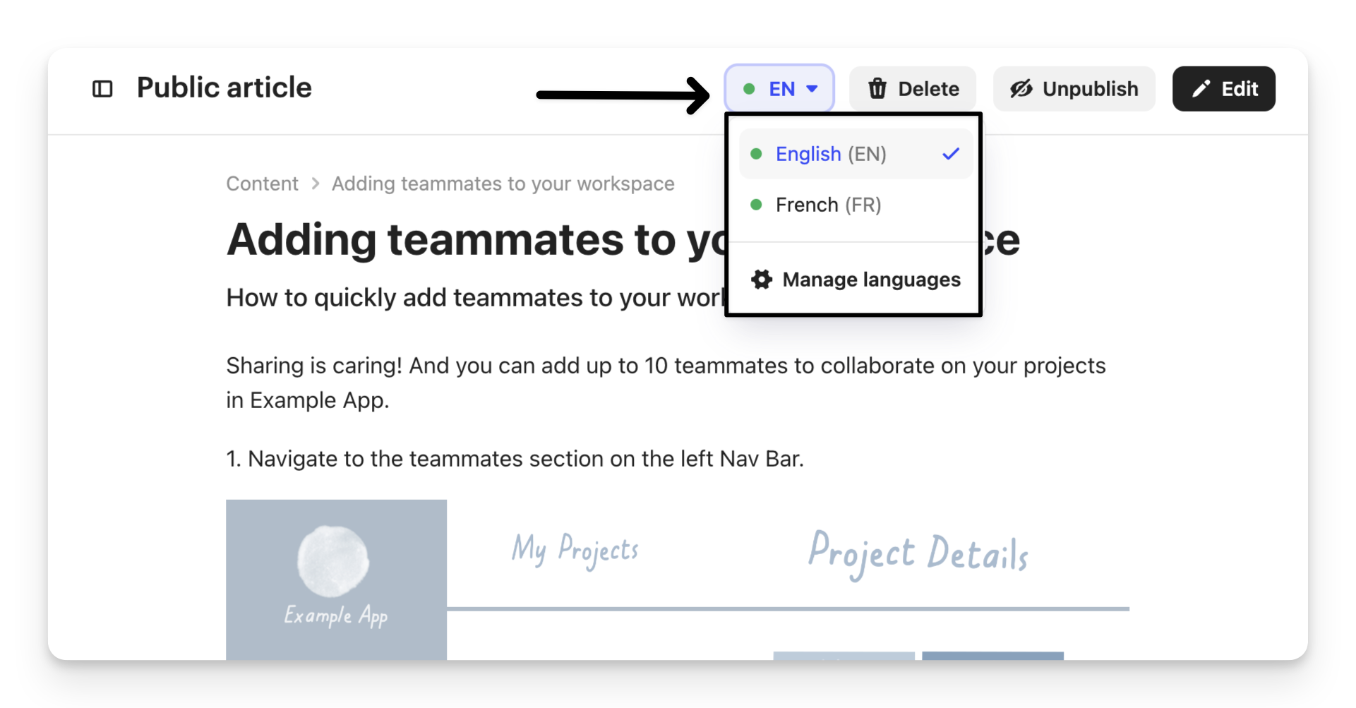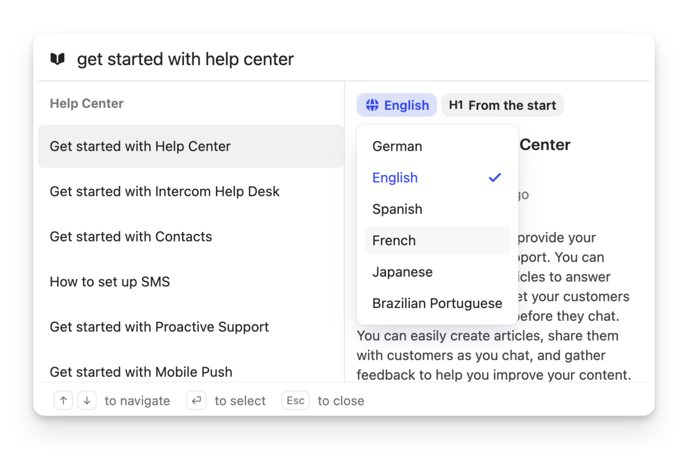 If you have a supported language (e.g. French), and a French visitor lands on your Help Center, they’ll only see the articles that you have translated. They can switch to your default language to see any articles you haven’t translated.