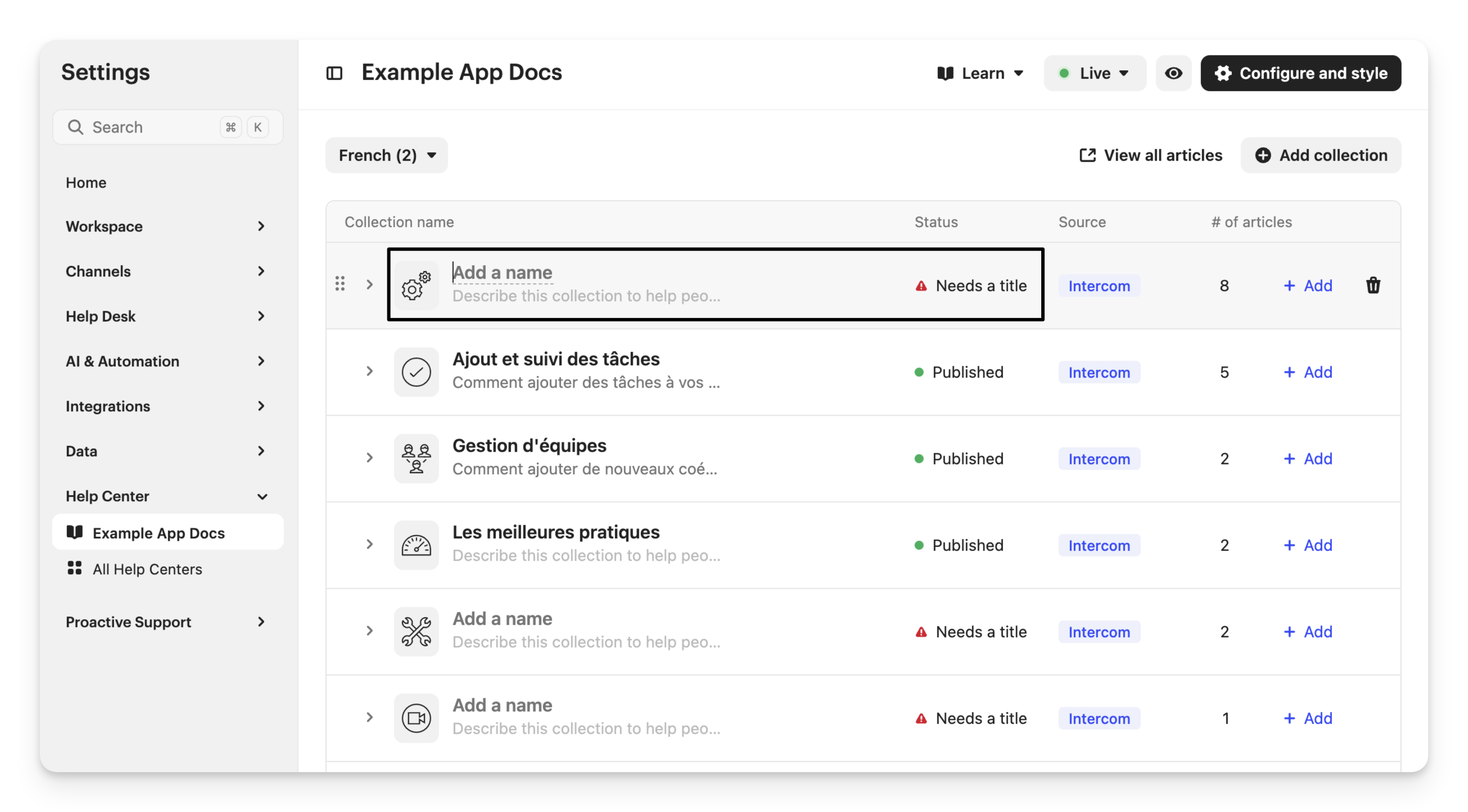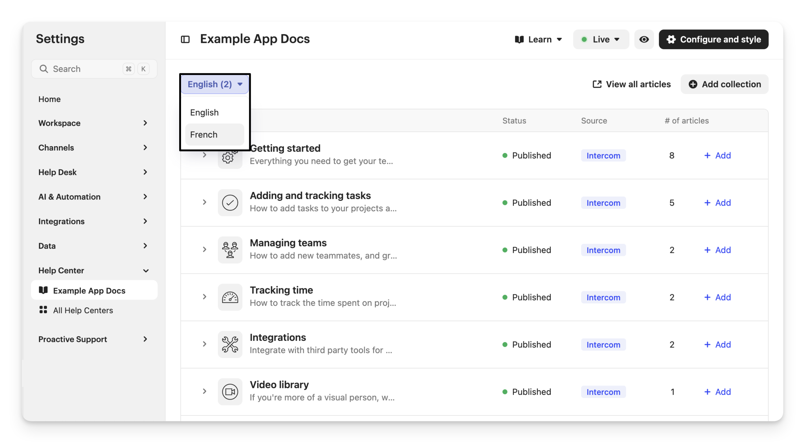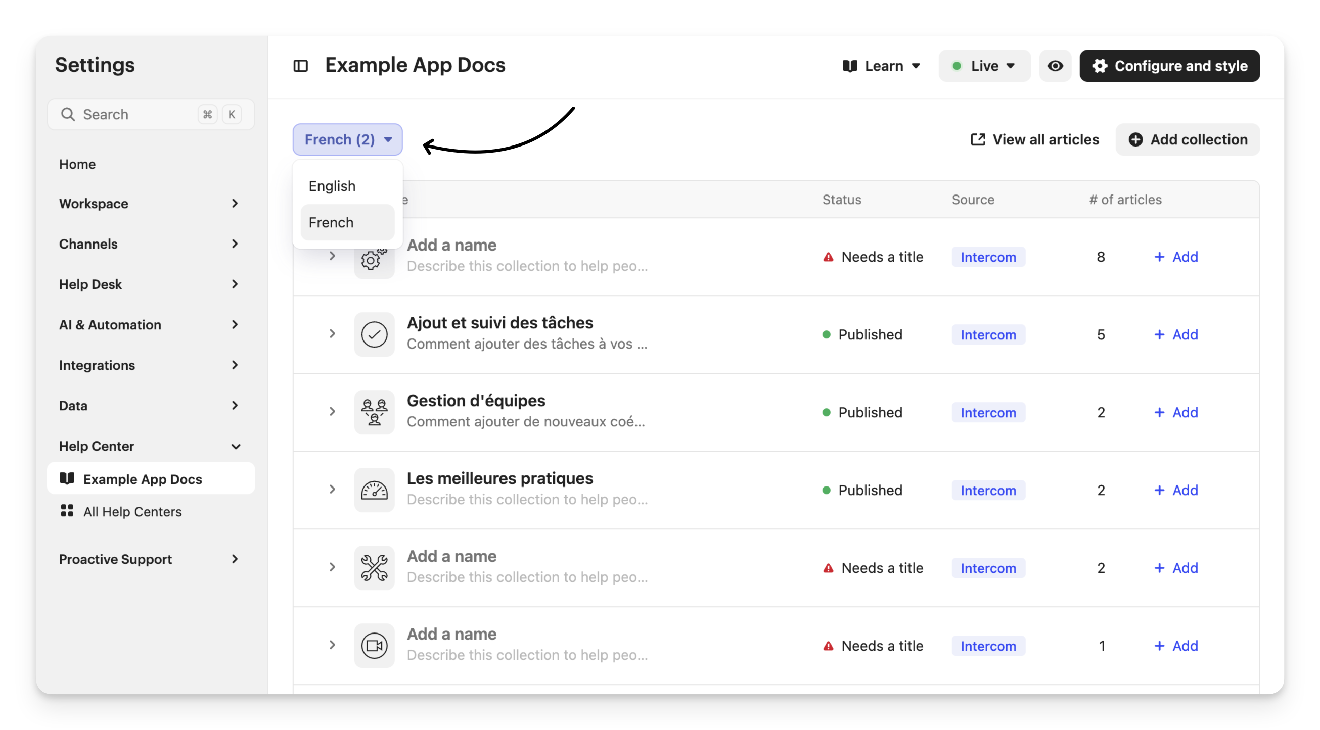 In Settings > Help Center > Collections, you’ll see all of your collections have a version for each language, which you can switch between when editing: