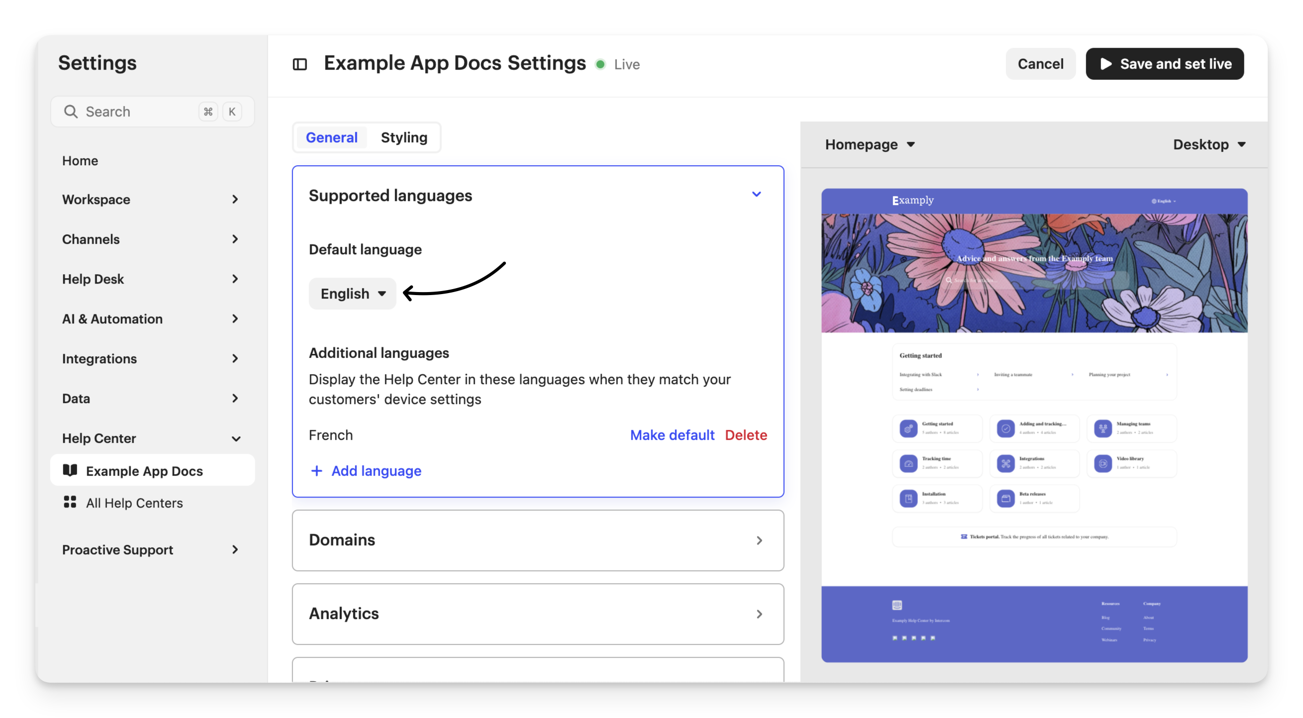 To set the default language, go to Settings > Help Center > Configure & Style and open Supported languages to choose a default language.