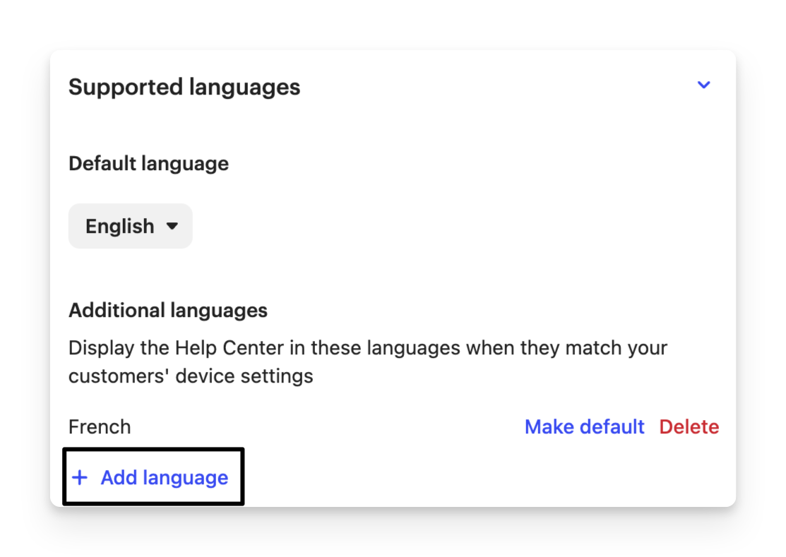 Before adding a new language, set the default language for your Help Center. This should be the most common language spoken by your customers. It’s also the language they’ll see if their browser is set to a language your Help Center doesn’t support.