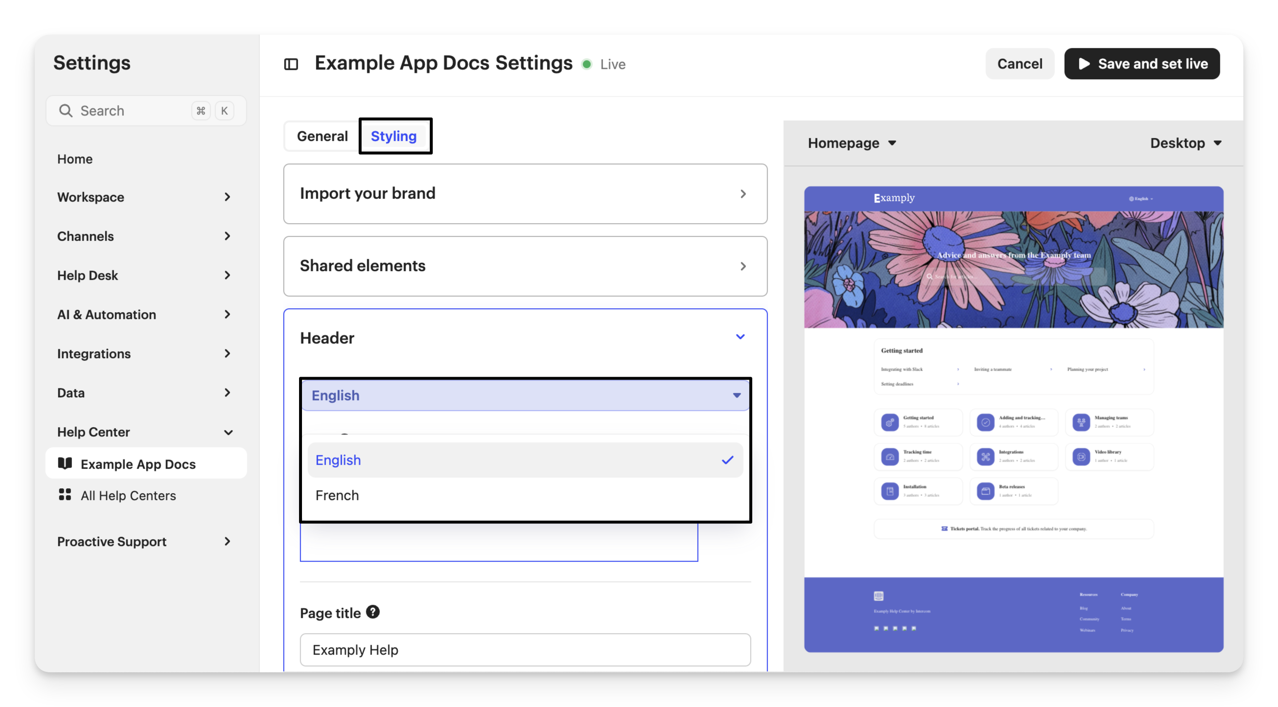 Next, go to Settings > Help Center > Configure & style and click on Styling then open Header and select the language to customize the page title and header text for each language.