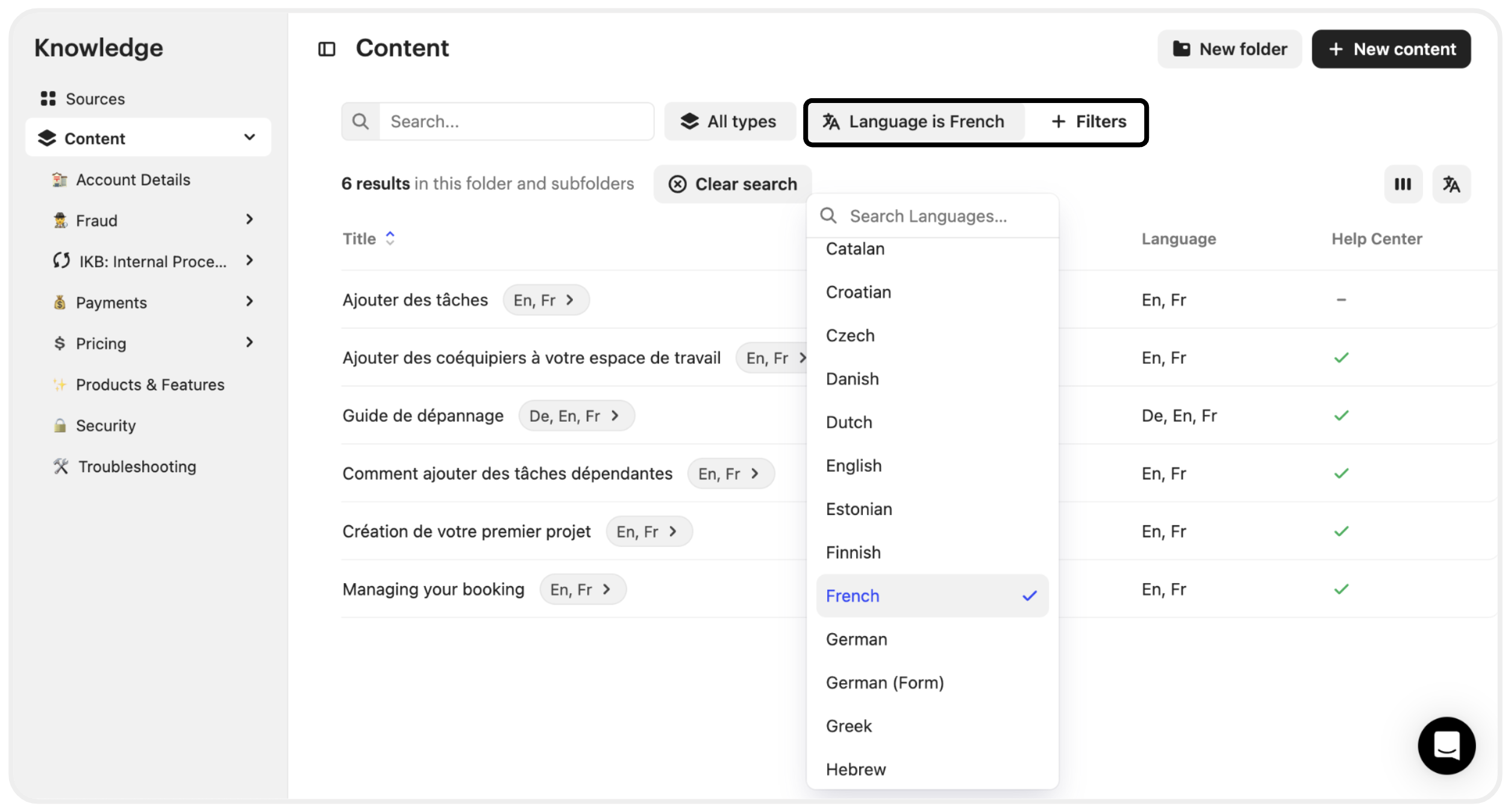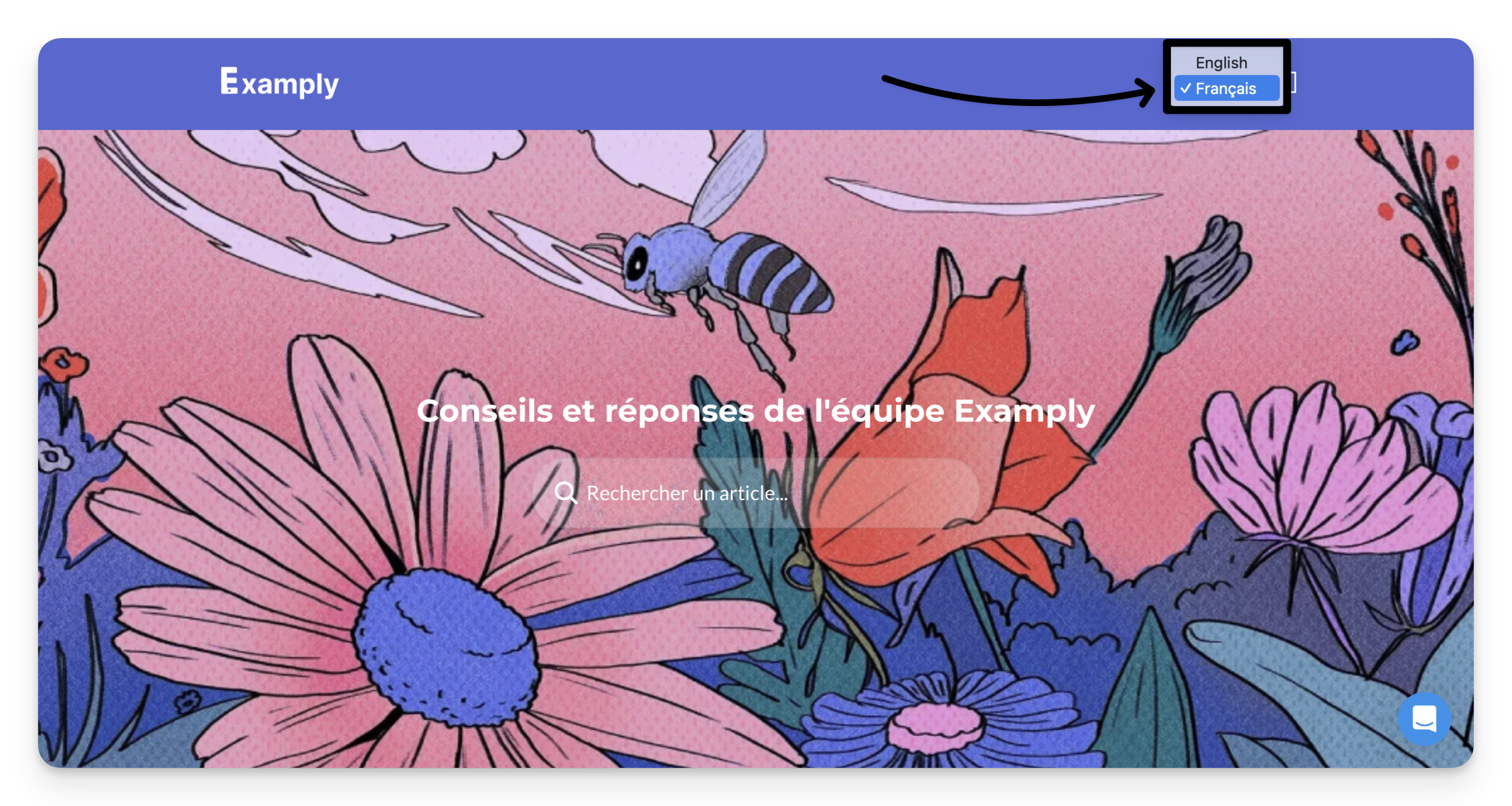 Once you’ve published articles in multiple languages, your Help Center will automatically detect your customers’ browser language, and show the matching articles. For example, when a French visitor lands on your Help Center, they’ll see your French articles. If they’d like to see the English version, they can easily switch the language: