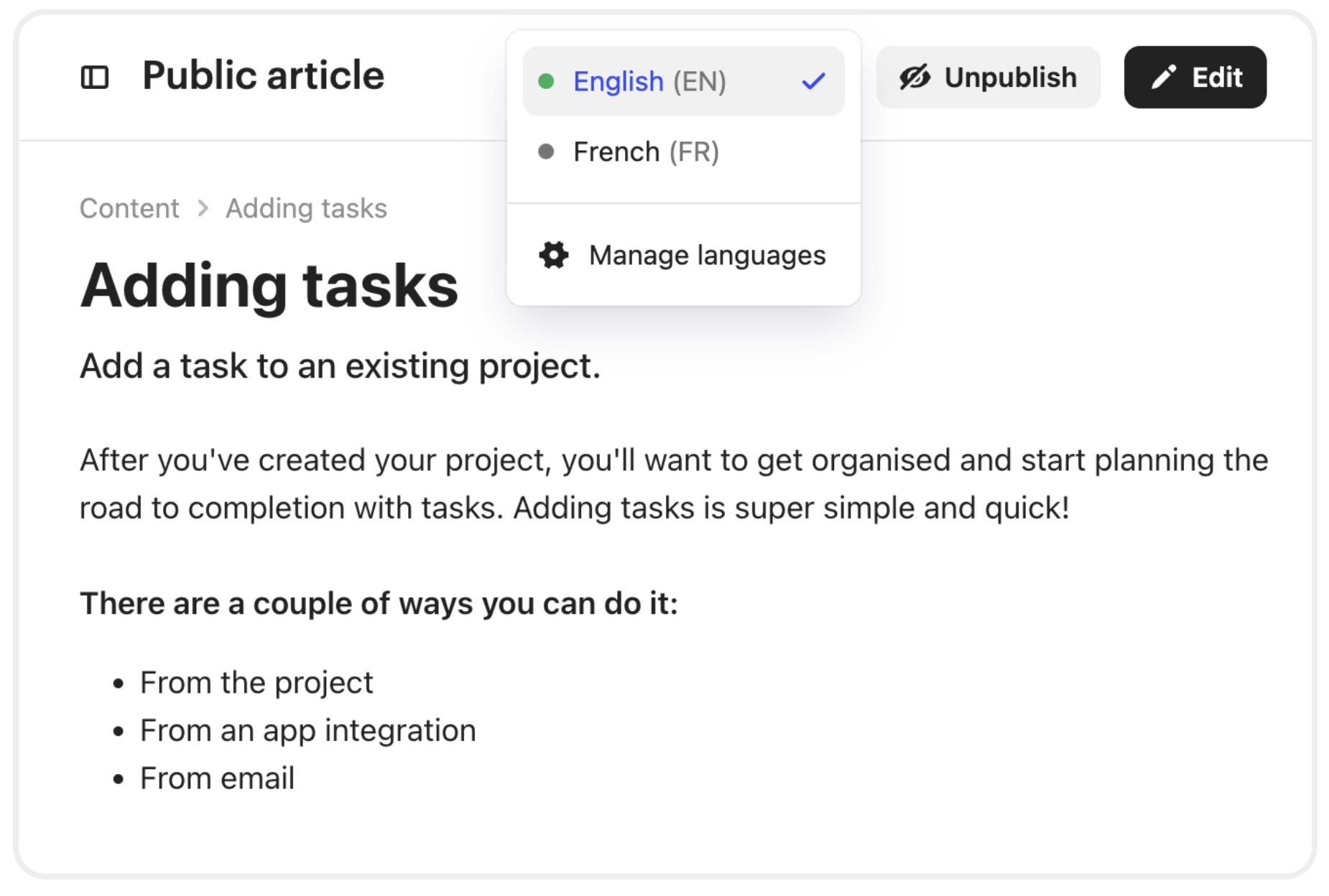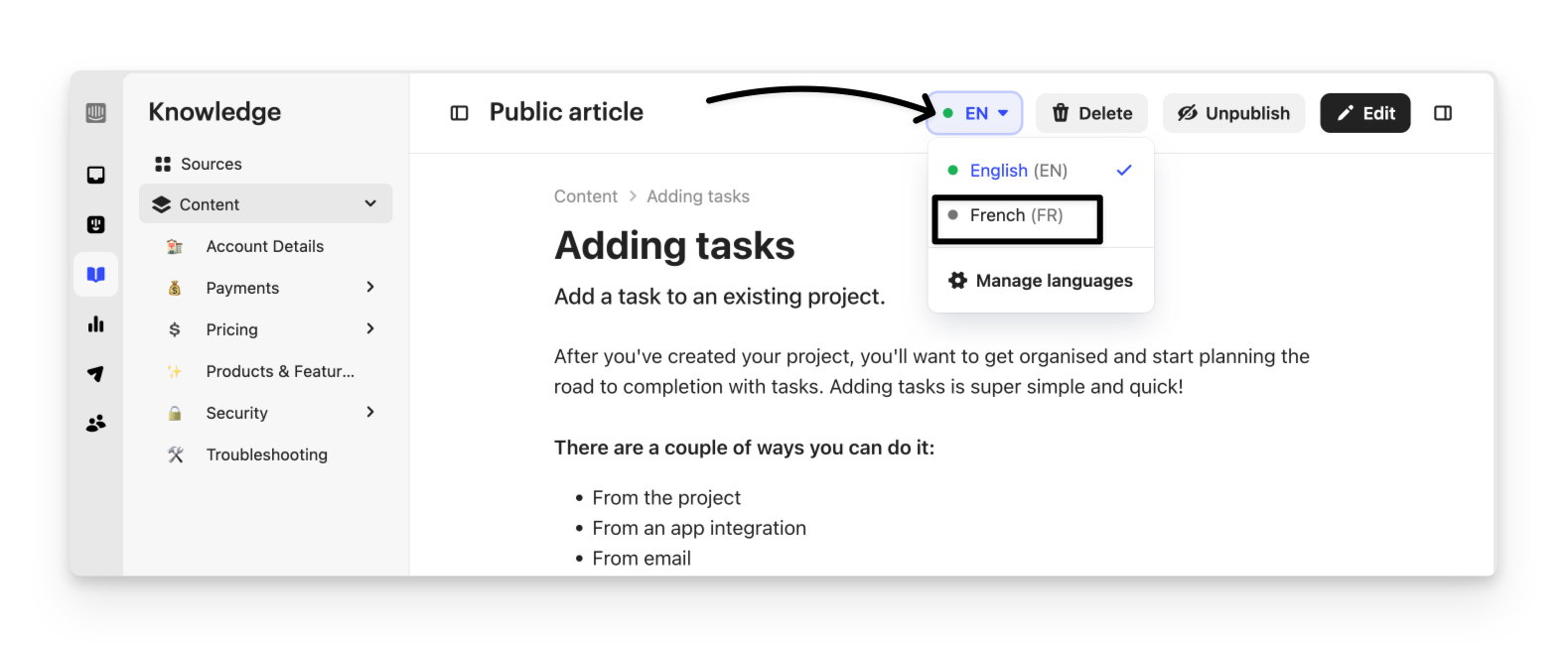 After you create a public article in your default language, switch to the language you’d like to add a translation for at the top of the page.