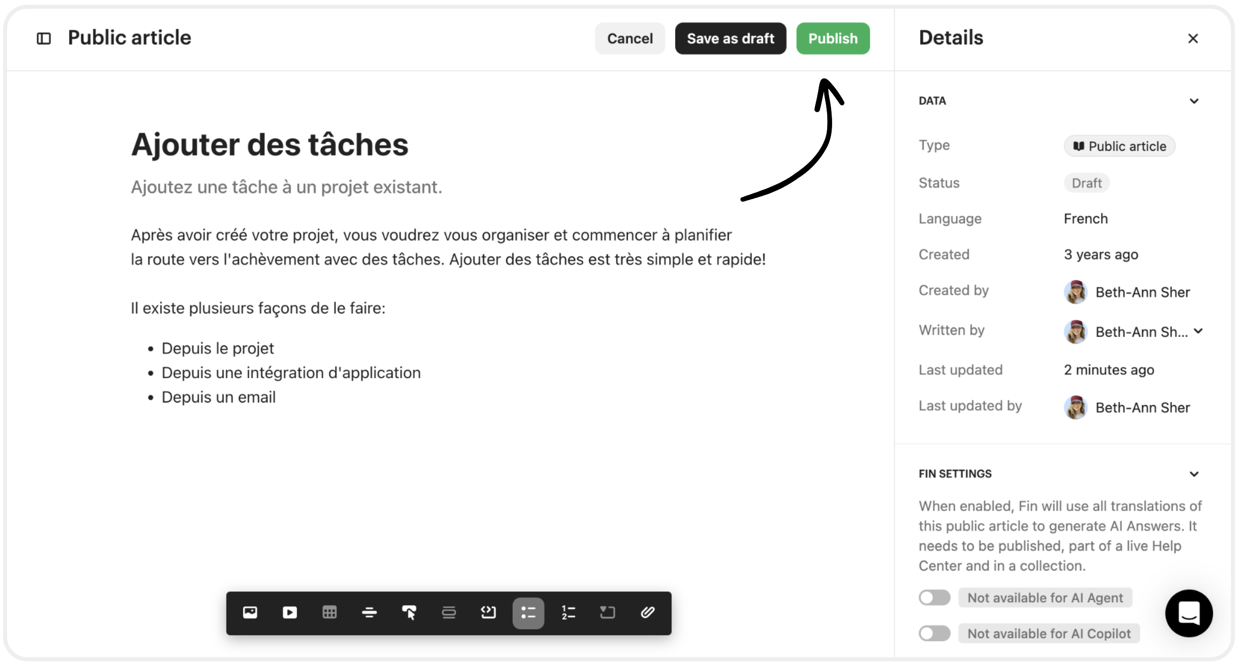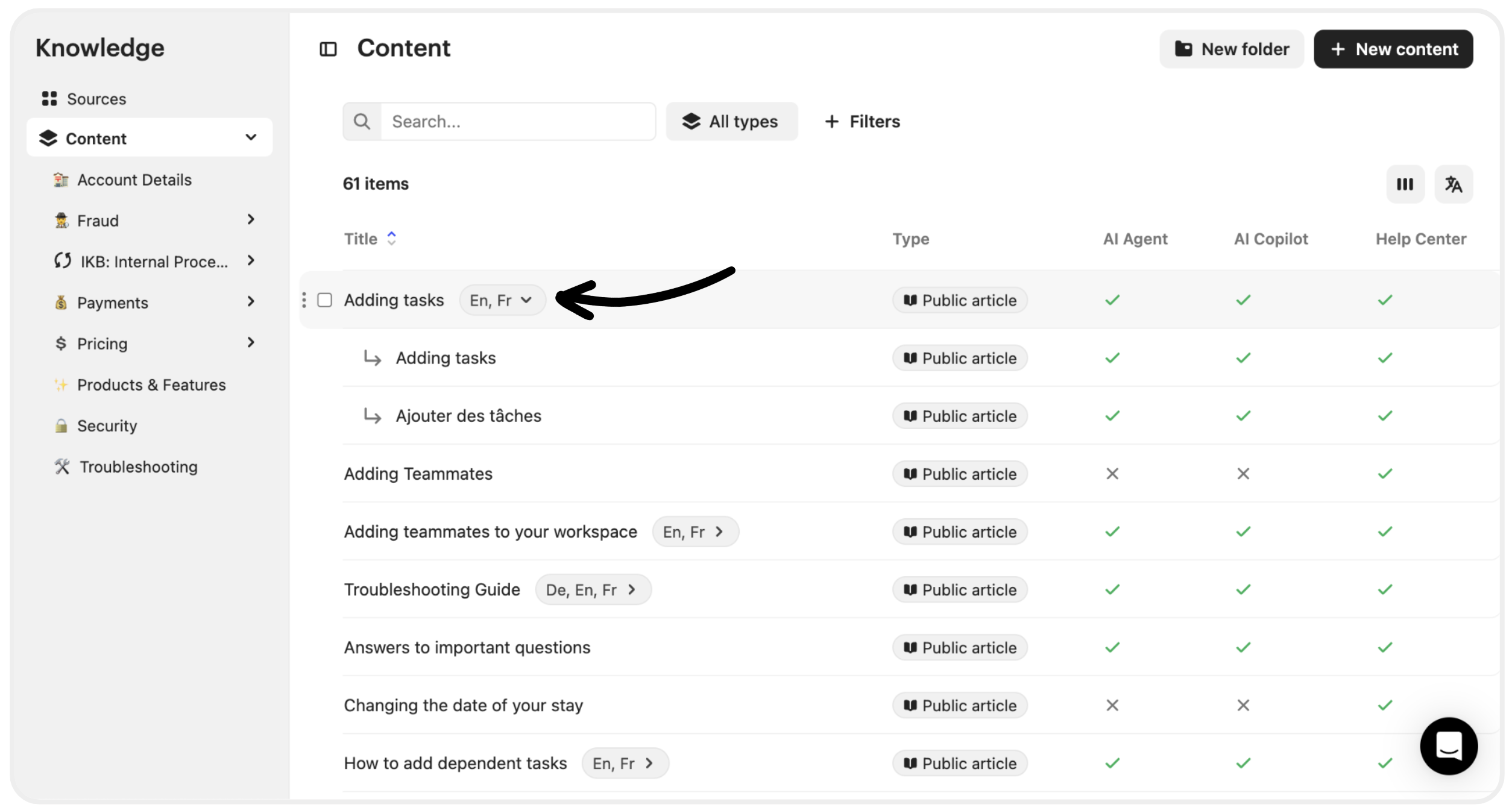 Your translated version will automatically be added to the same Help Center collection as the original version and will be made available to Fin AI Agent and Fin AI Copilot. You can manage these settings in the Details panel next to the article.
