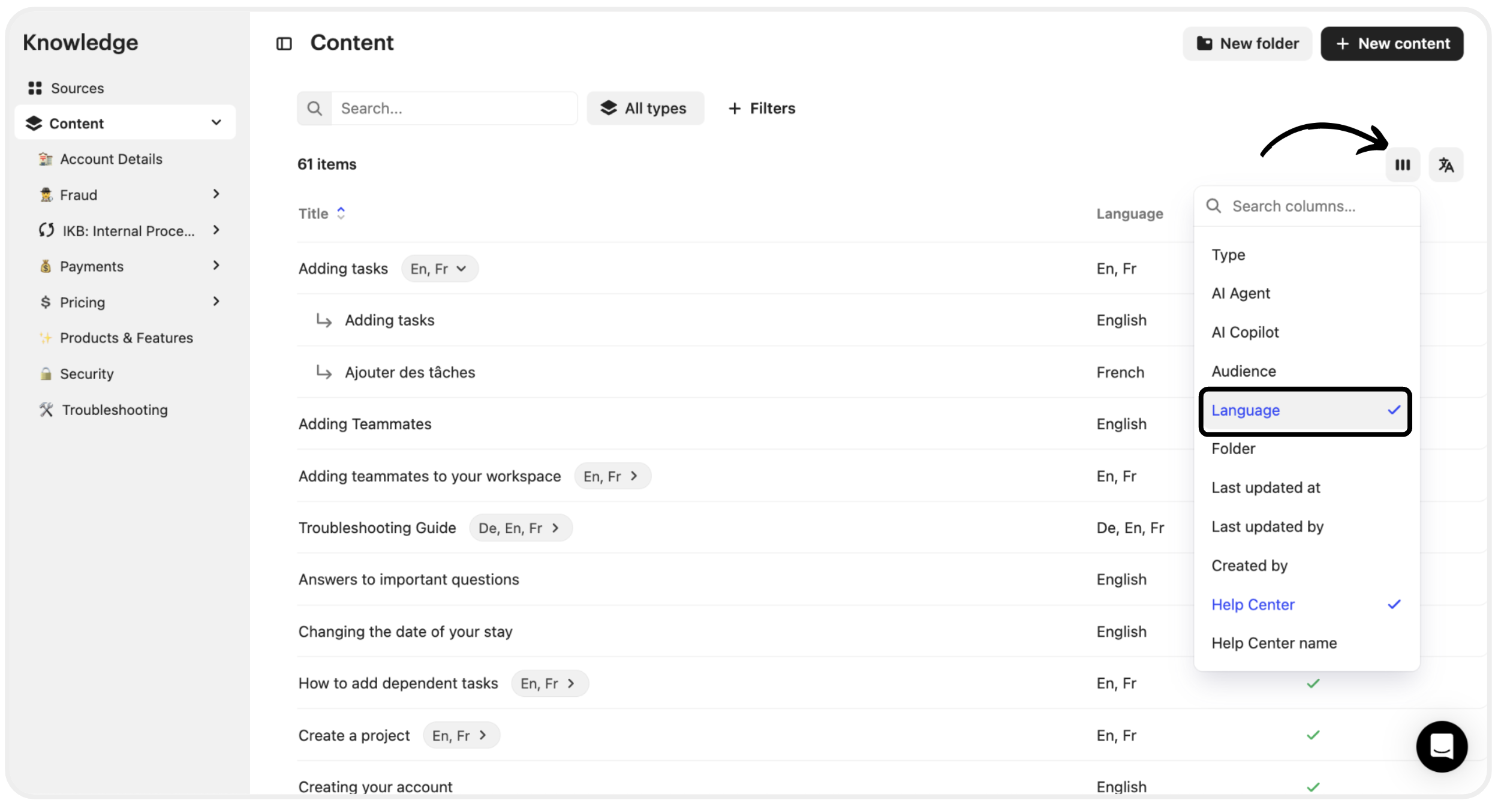 The Knowledge > Content page shows a language label next to each public article with multiple translations.