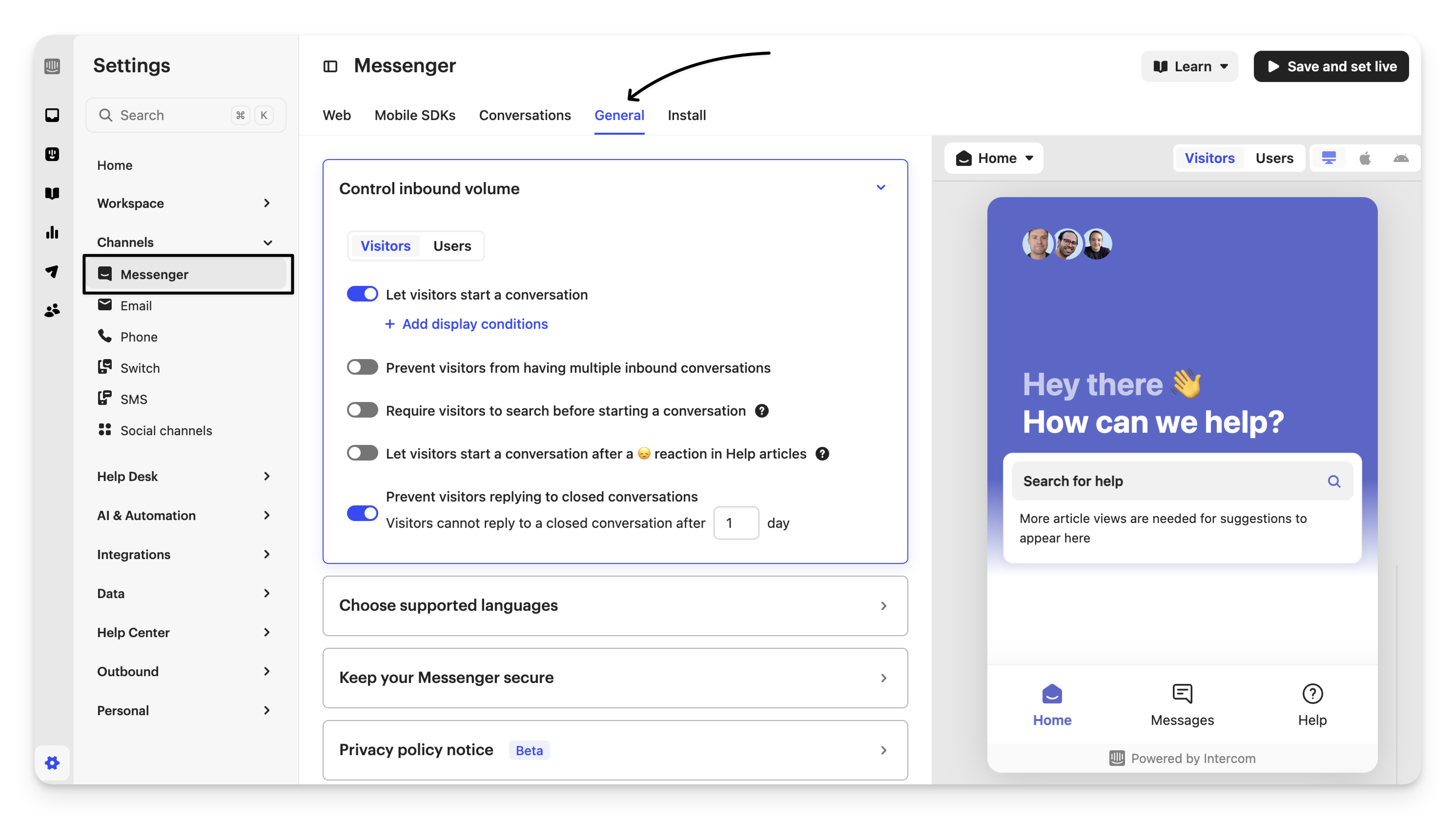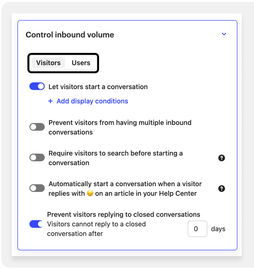 You can control who has the ability to start a conversation with your team and tailor the level of support you offer. This lets you encourage some users or leads to search your Help Center, or take advantage of other self-serve options instead.