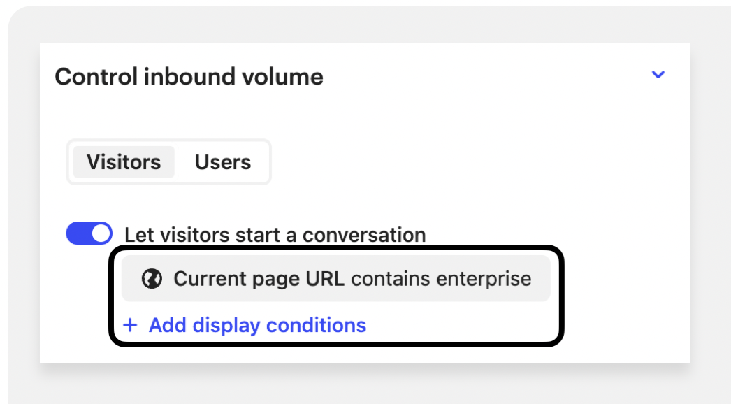 This example will only allow visitors to start a new conversation if they’re on the “Enterprise” page of your website, to ensure that your sales team are only chatting with high value leads. There are many other ways to tailor the ability to start a new conversation, like users on a certain plan or those who are participating in a beta.