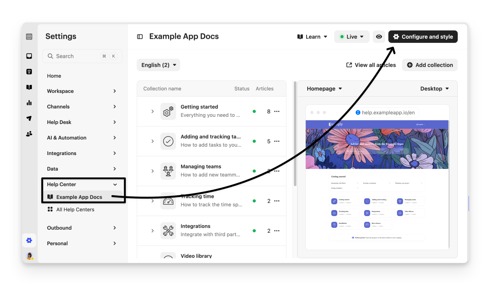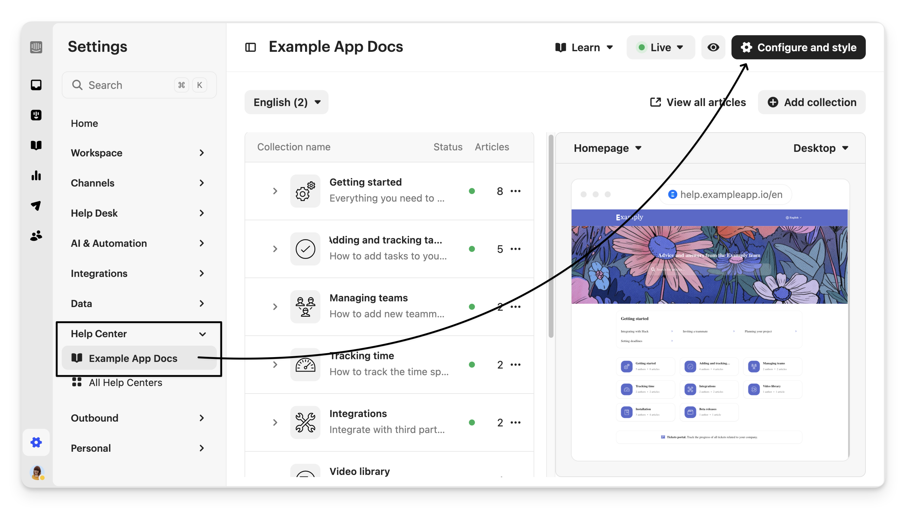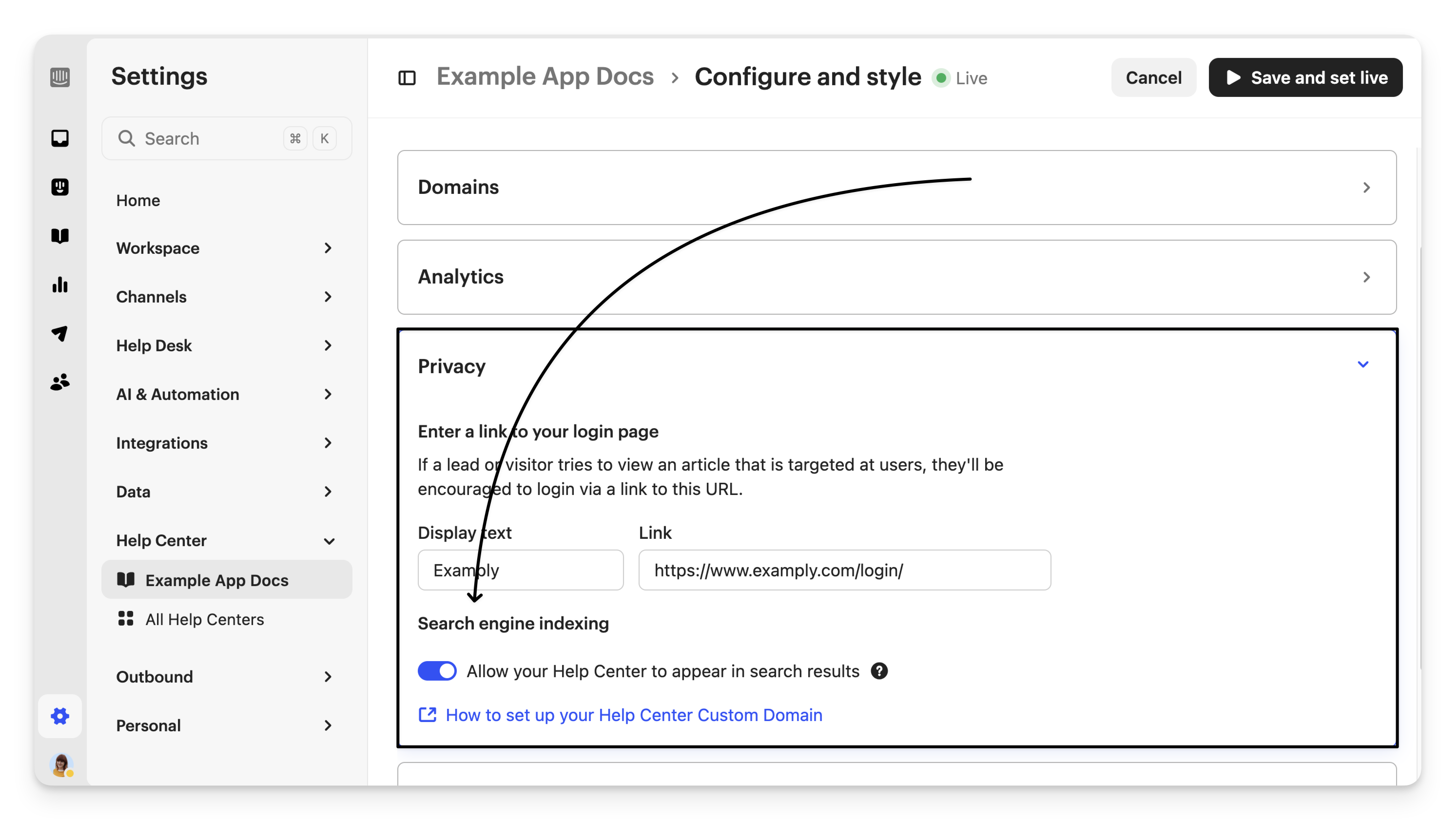 First, make sure to have Search engine indexing enabled in your Help Center settings before starting the migration. This will prevent delays in the articles being available when you search. You can do this by going to Settings > Help Center and clicking on "configure and style":
