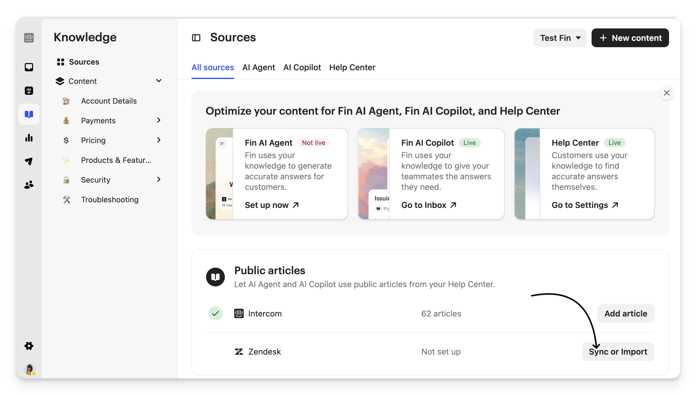 To start importing public articles, go to Knowledge Hub > Sources and click on Sync or Import under public articles.