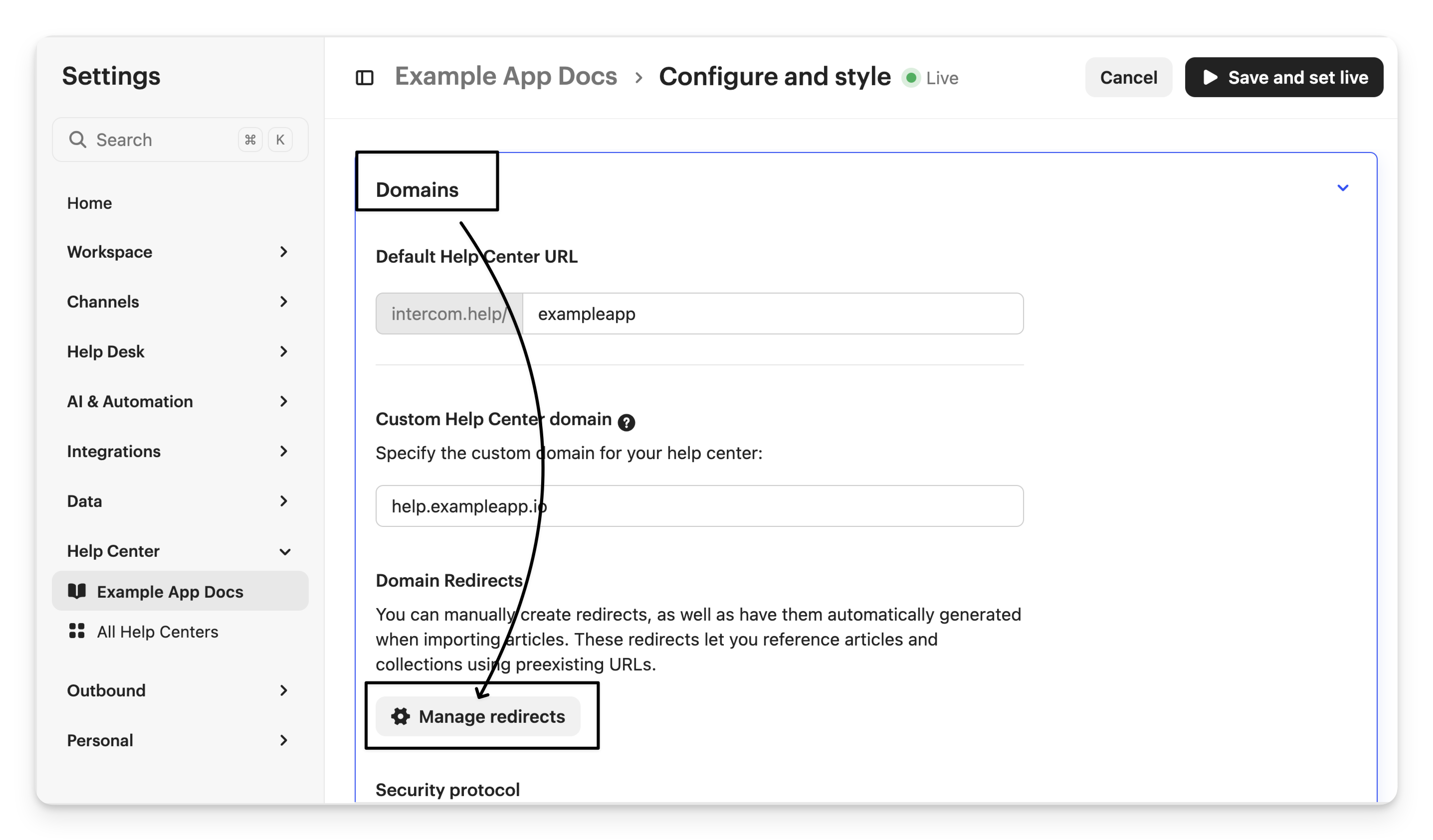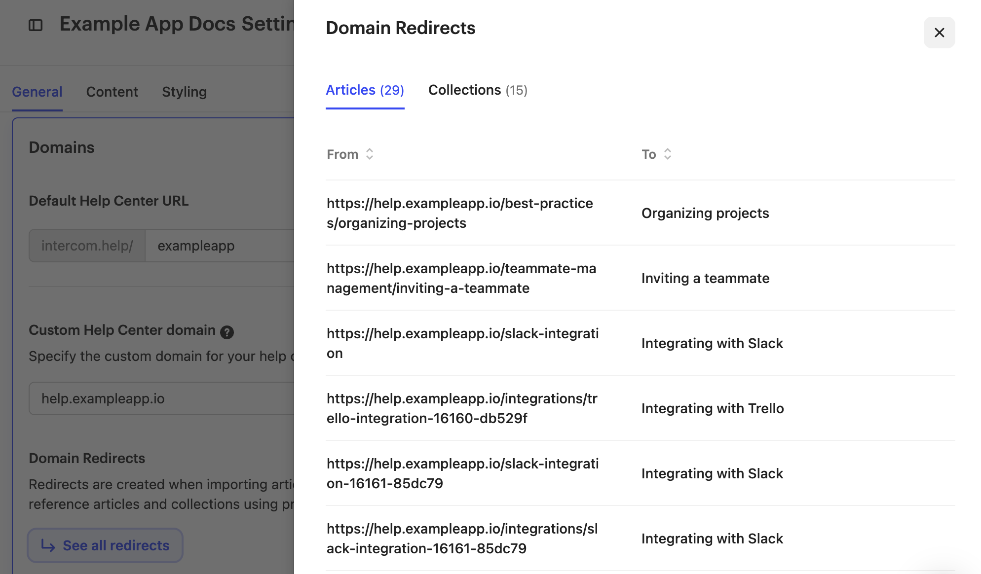 After the import is complete, you can review the generated redirects through the Domains section in Settings > Help Center > Configure and style:
