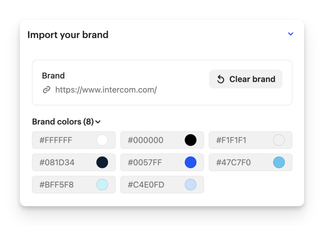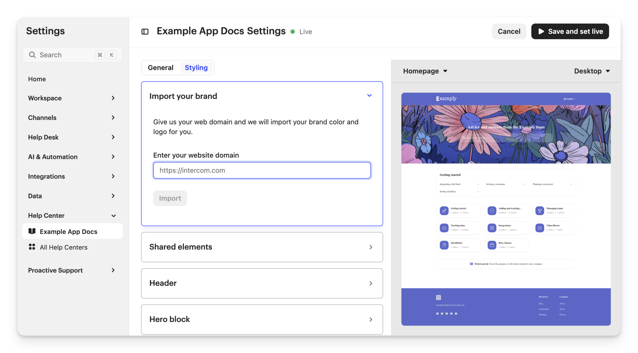 Go to Settings > Help Center > Configure & Style, click on Styling and open Import your brand to enter the URL of your brand. Intercom will then automatically style your Help Center to look like your brand.