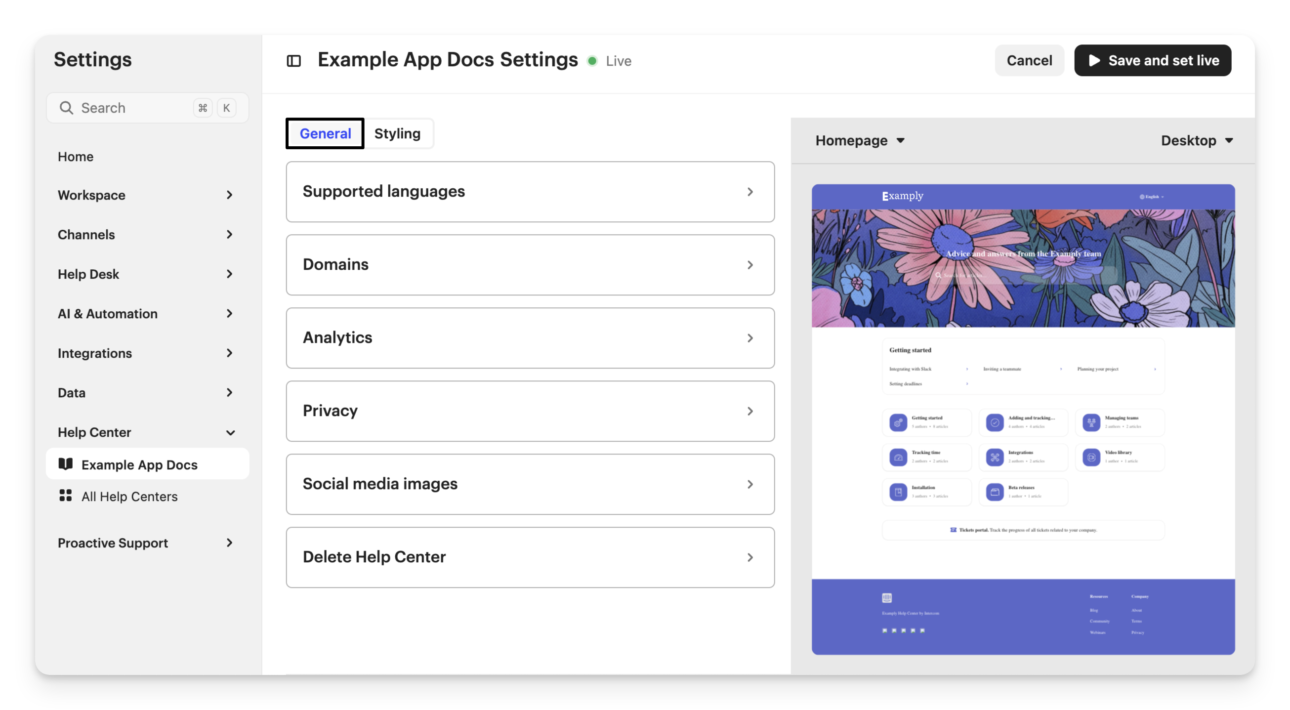 To set up your Help Center Supported languages, Domains, Analytics, Privacy, and Social media images go to Settings > Help Center > Configure & Style and open the General tab.