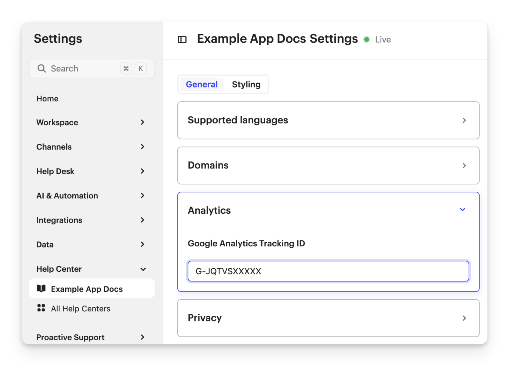 Once you've copied your GA4 Measurement ID from your Google Analytics account, go to Settings > Help Center > Configure & Style and open Analytics then paste this under "Google Analytics Tracking ID".