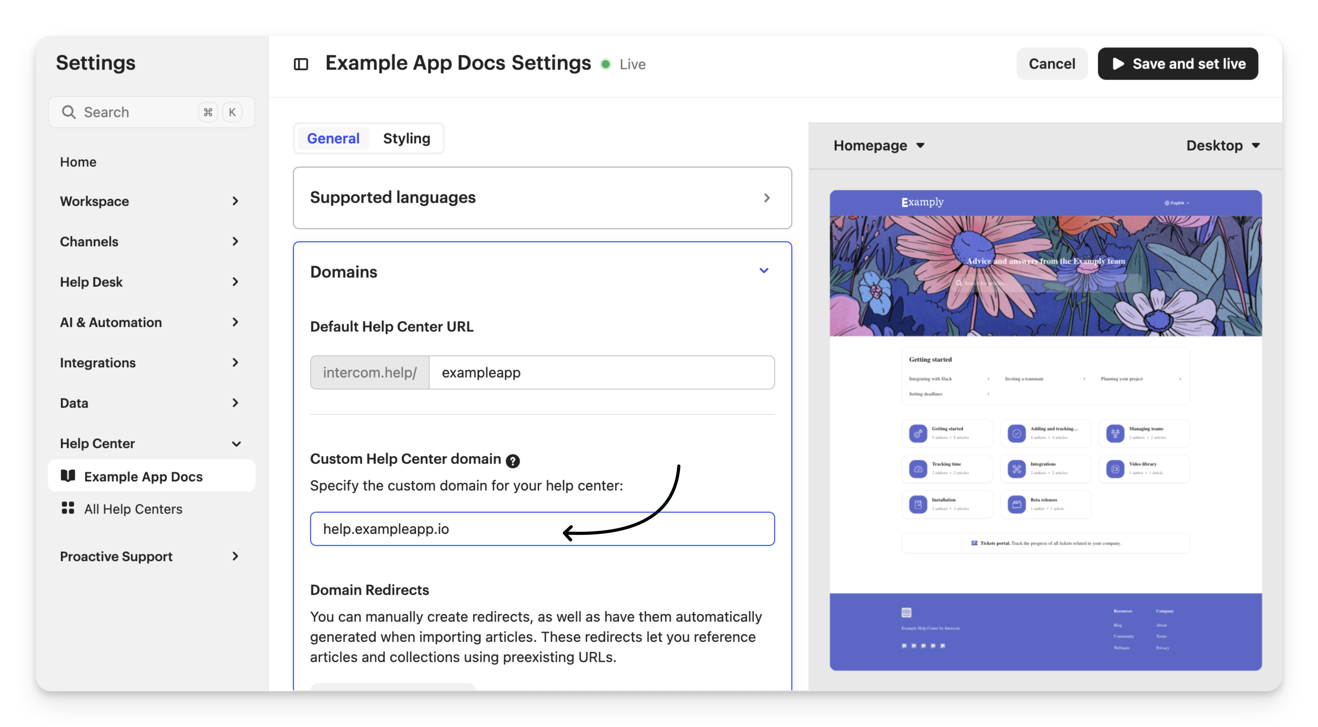 Then go to Settings > Help Center > Configure & Style and open Domains to enter your custom Help Center domain URL and click Save and set live.