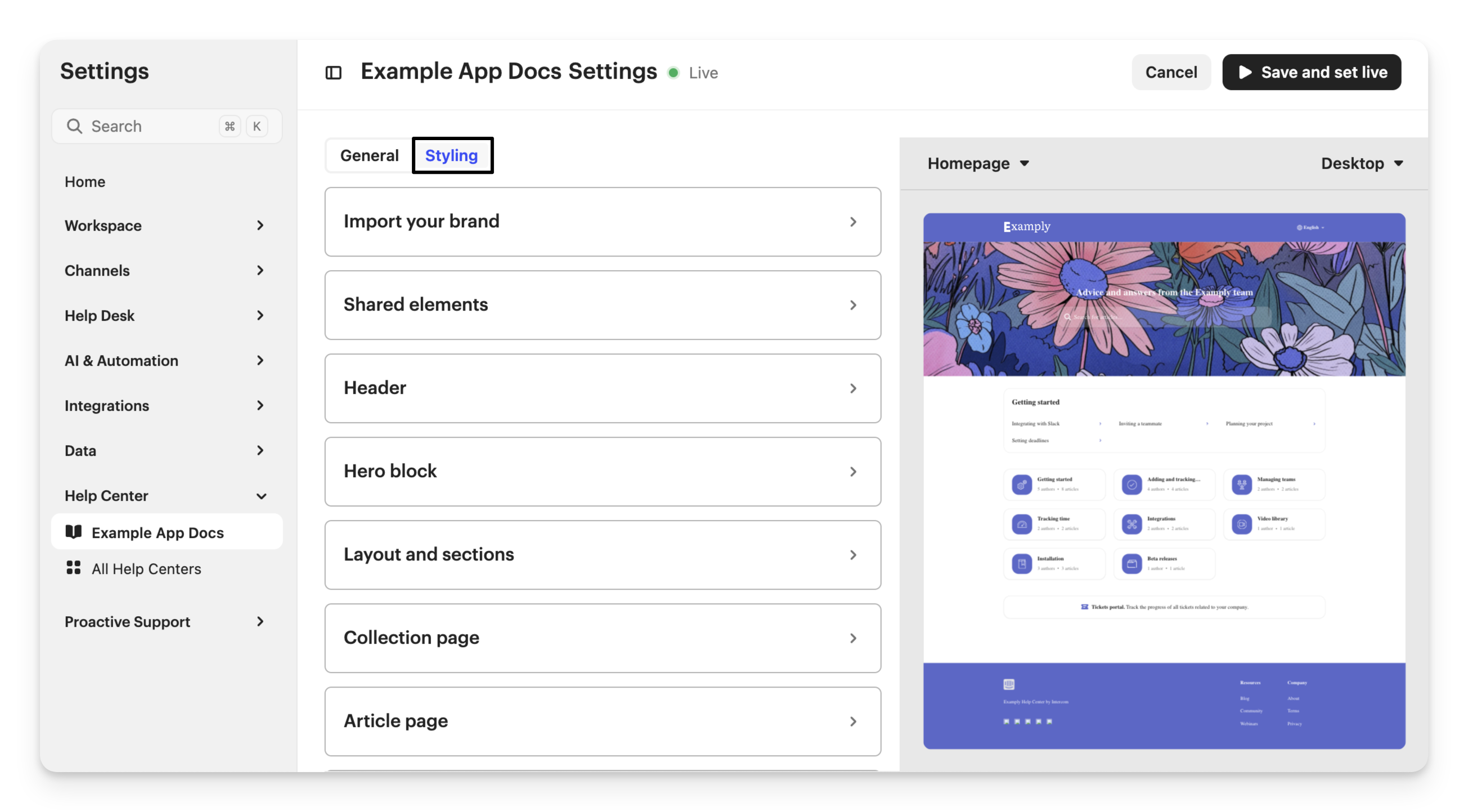 To manage your Help Center styling and how content appears on the homepage, collections, articles, header and footer, go to Settings > Help Center > Configure & Style and open the Styling tab.