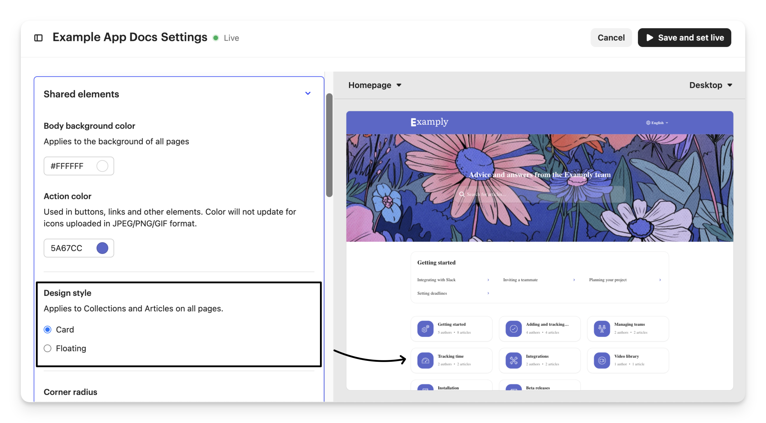 Choose between the Card or Floating design style which applies to Collections and Articles on all pages.