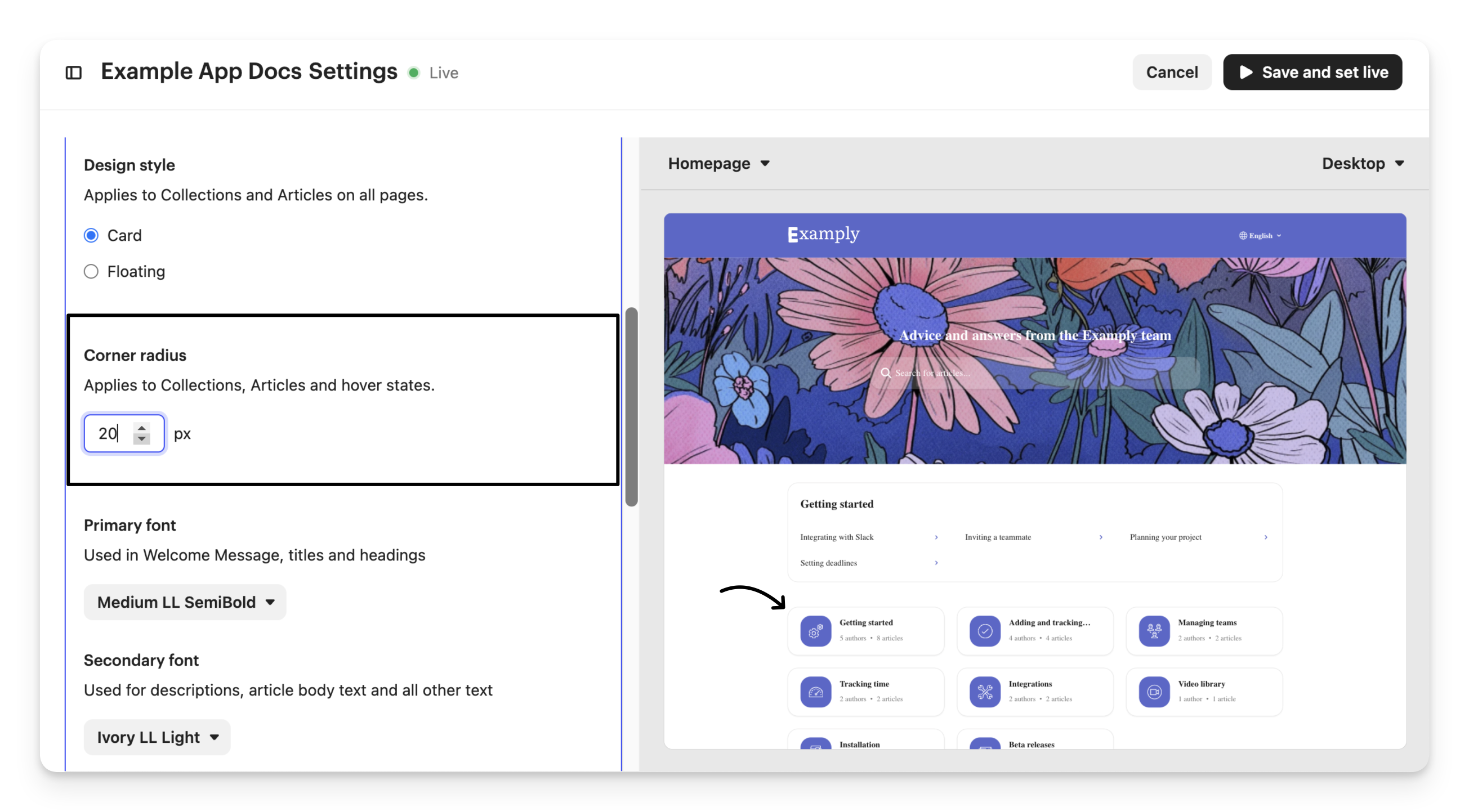 Then set the corner radius for elements on your Collections, Articles and hover states (when hovering over Articles within a Collection).