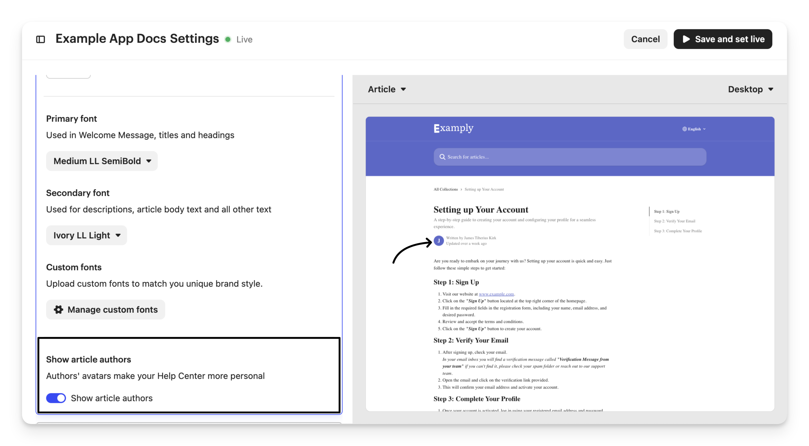 Show or hide article authors in the Homepage, Collections and Articles by going to Settings > Help Center > Configure & Style.