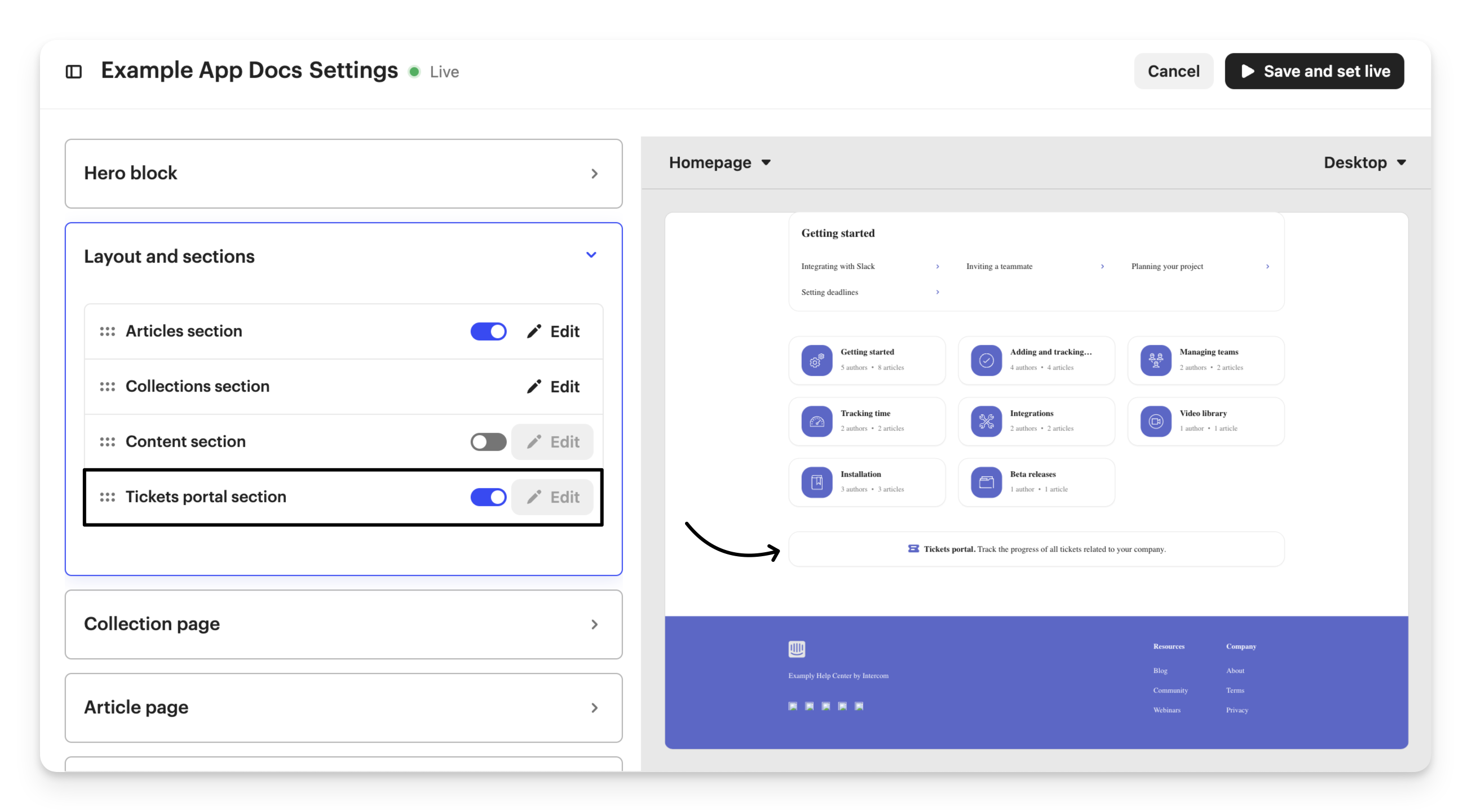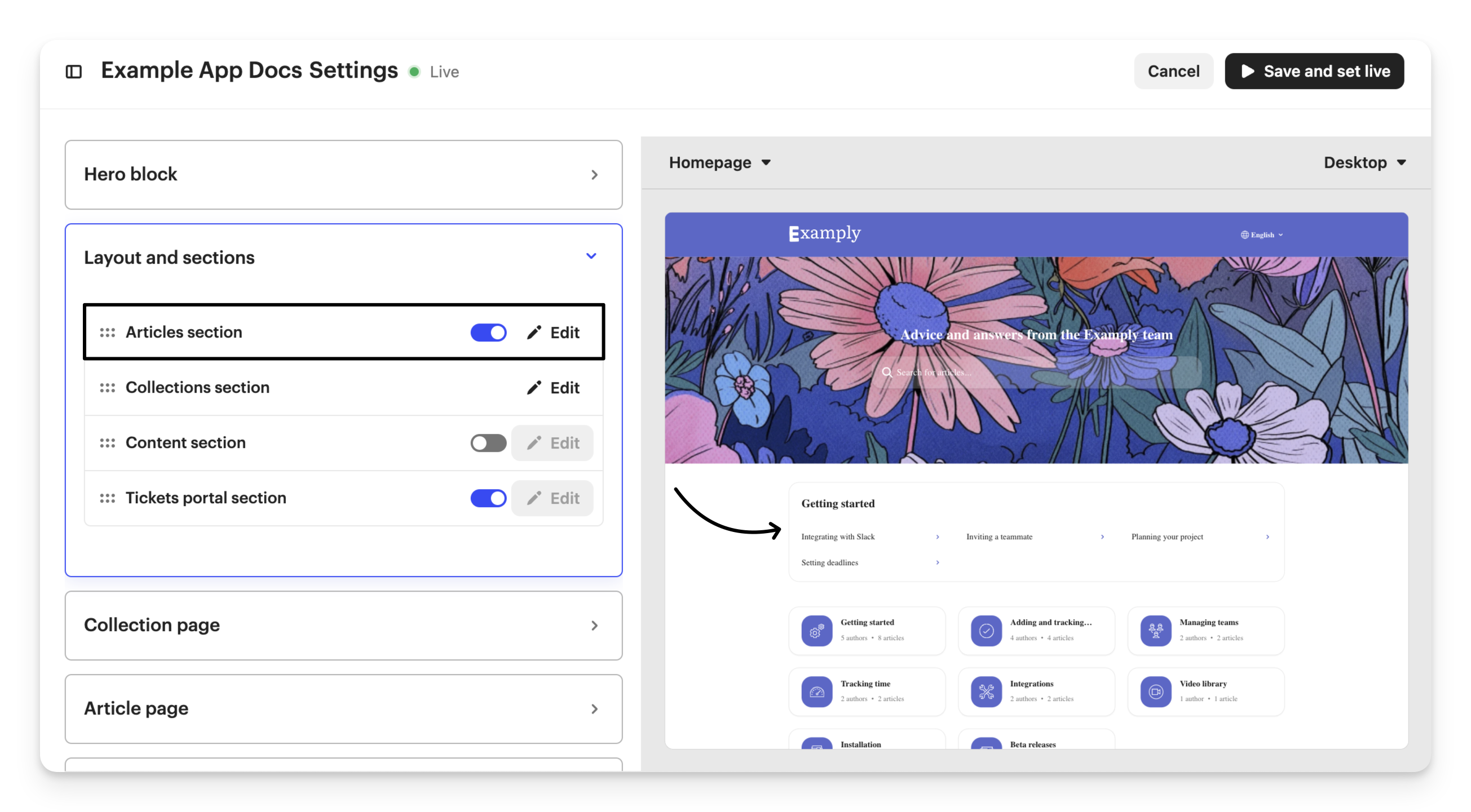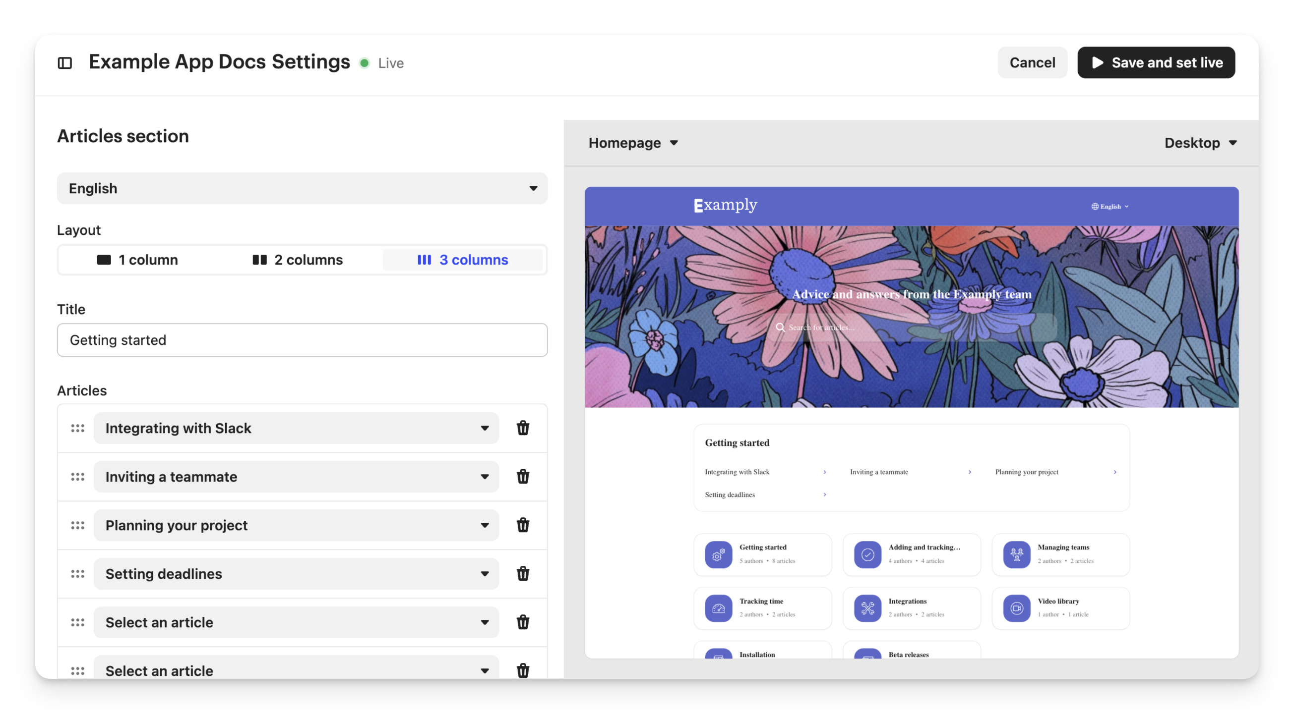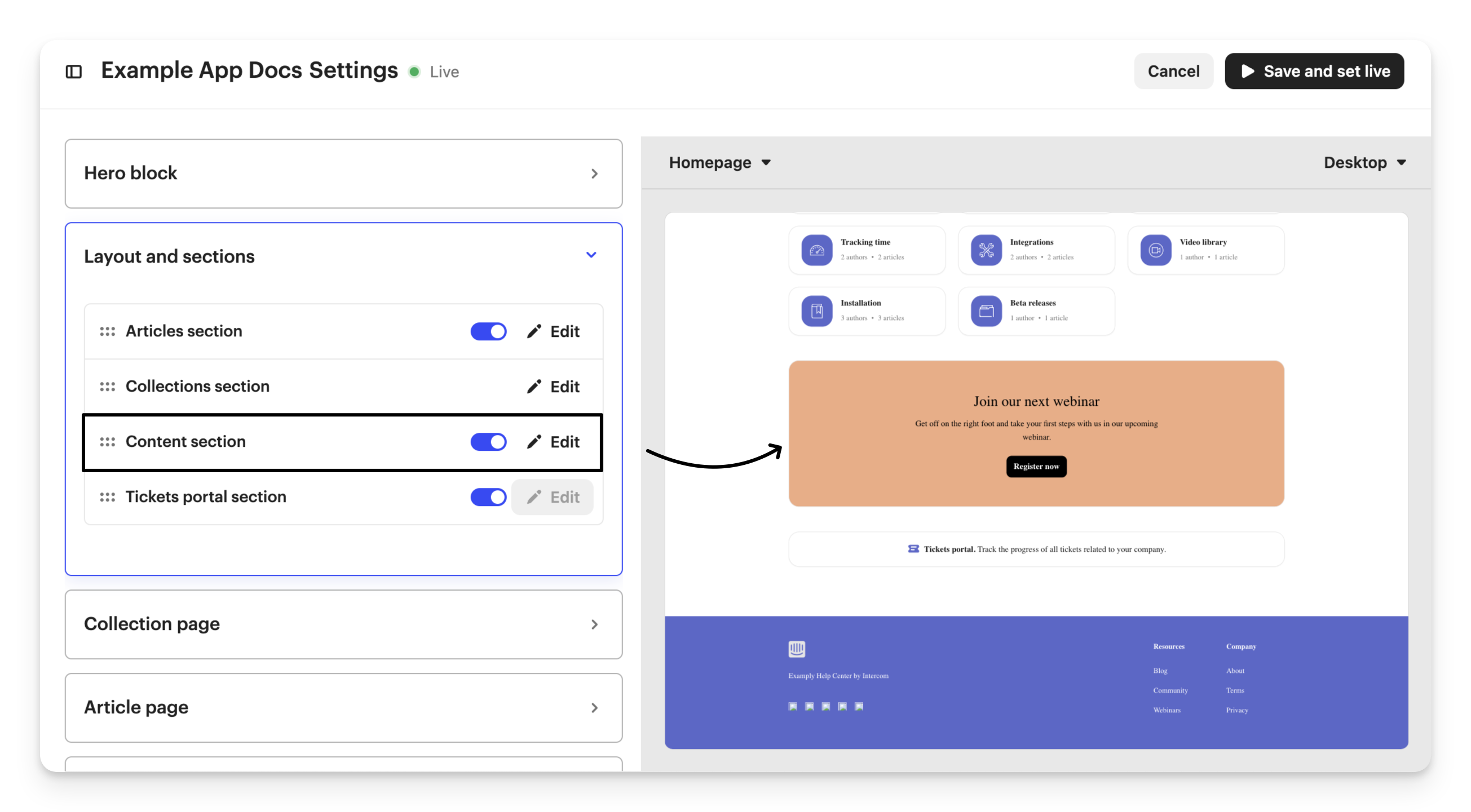 Remember to select Save and set live when you're ready to add the content section to your Help Center.