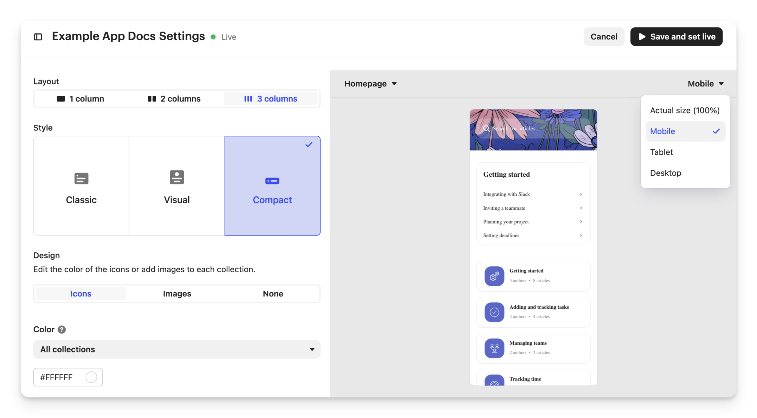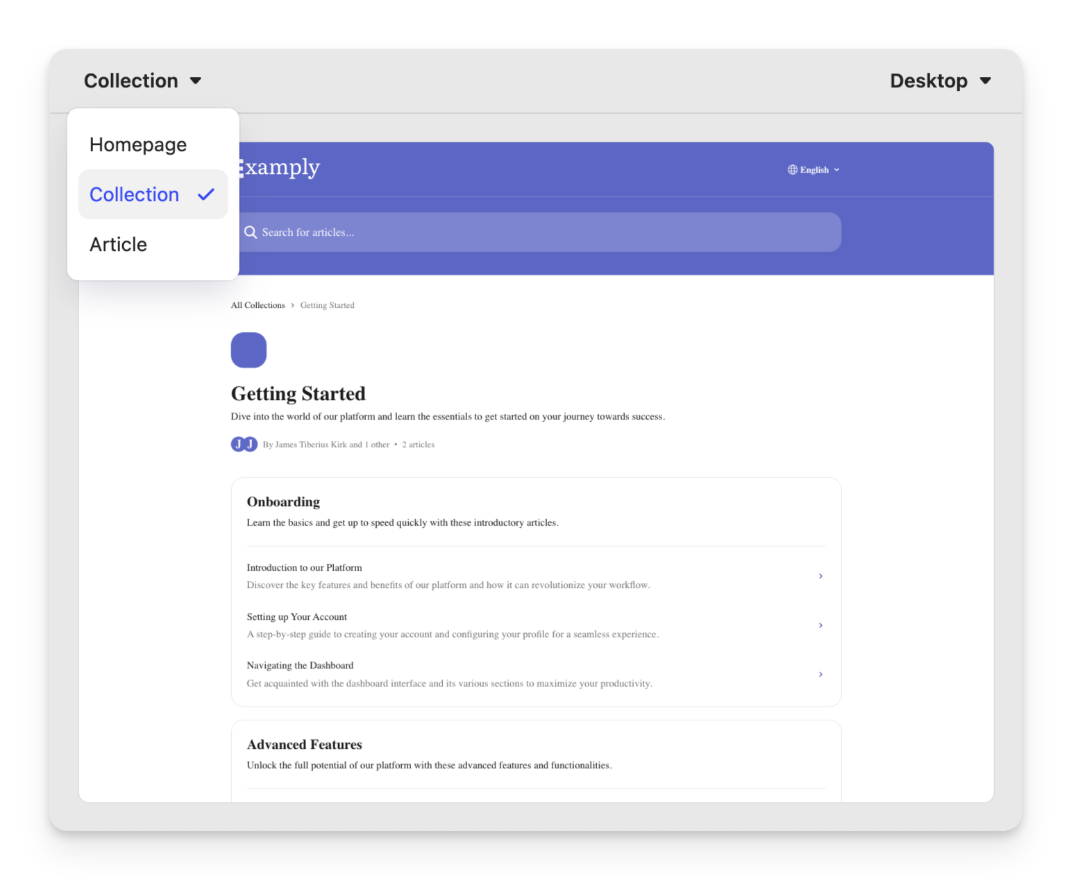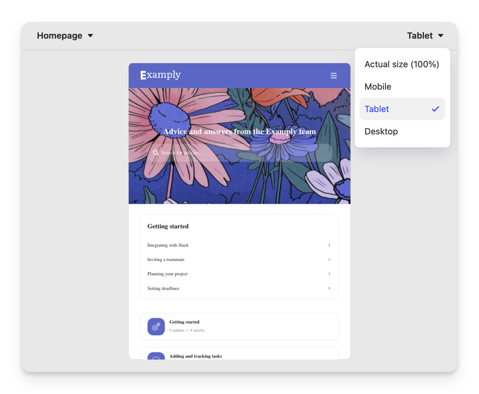 It’s easy to visualize your branded Help Center and see any changes you've made in real-time before setting them live, using the Preview for Homepage, Collections and Articles.