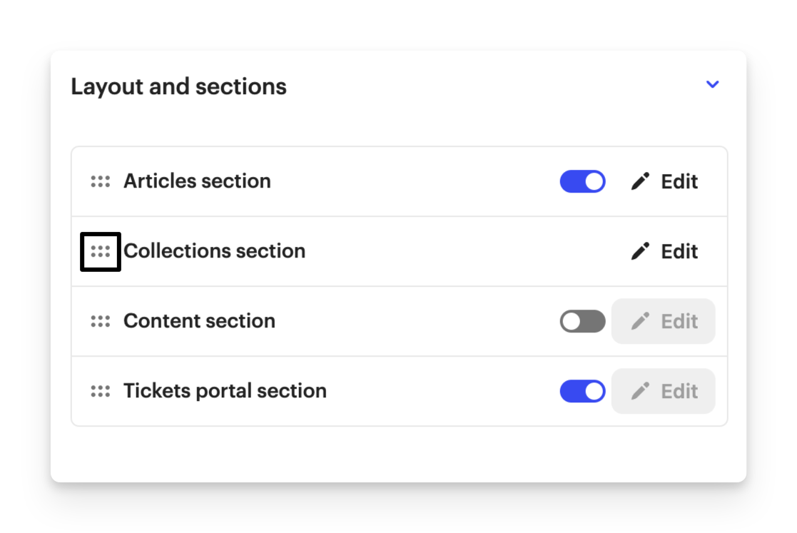 From Settings > Help Center > Configure & Style, click on the Styling tab and open Layout and sections to design how Collections are displayed and choose to enable sections for Articles, Content, and Tickets Portal on the homepage. Click Edit to set up each one.