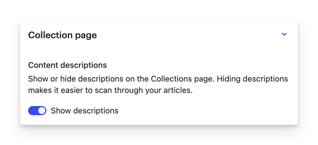 From Settings > Help Center > Configure & Style, click on the Styling tab and open Collection page to show or hide "Content descriptions" on each of your collections. Hiding descriptions makes it easier to scan through your articles, showing descriptions helps customers understand what to expect inside that collection.