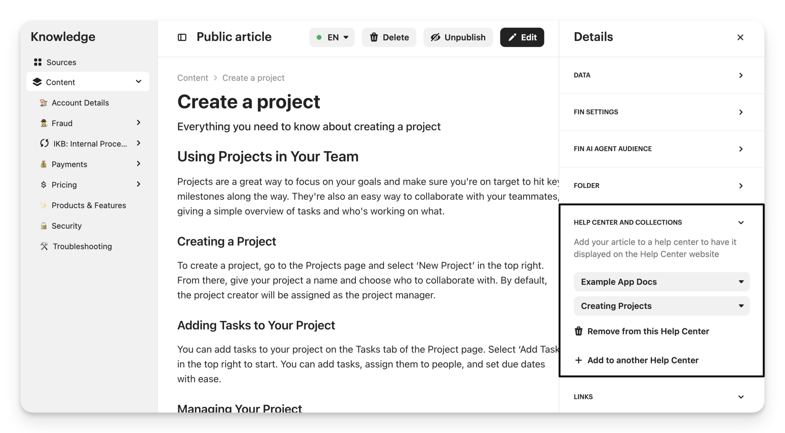 To change the collection a public article is in, open the public article in the Knowledge Hub and go to the Help Center and Collections section on the Details panel.