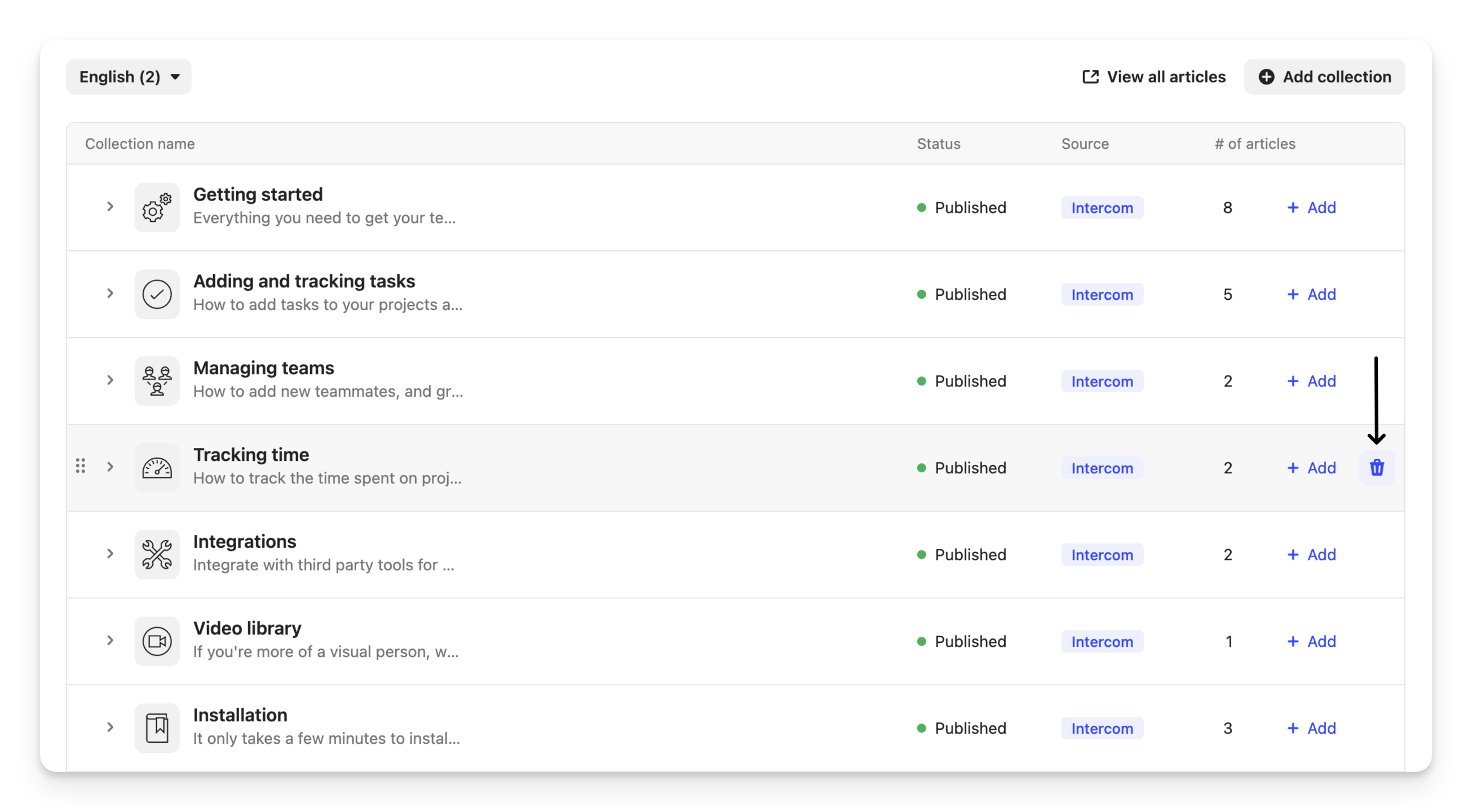 Both articles and collections can be removed from your Help Center from Settings > Help Center > Collections. Hover over the article/collection you want to remove and click on the trash icon.